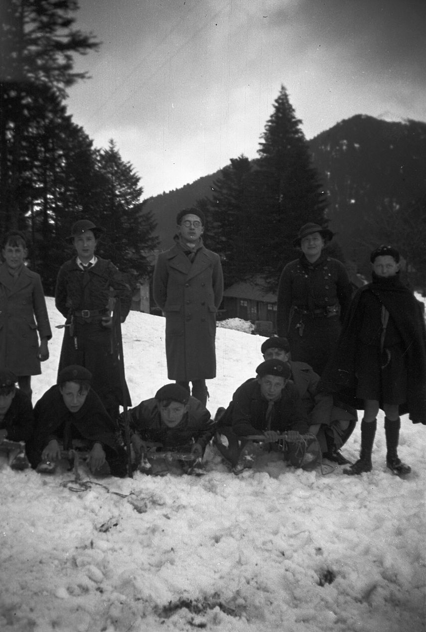 110 Fi 40, Jeunes scouts accompagnés de leurs monitrices prenant la pose sur des luges.