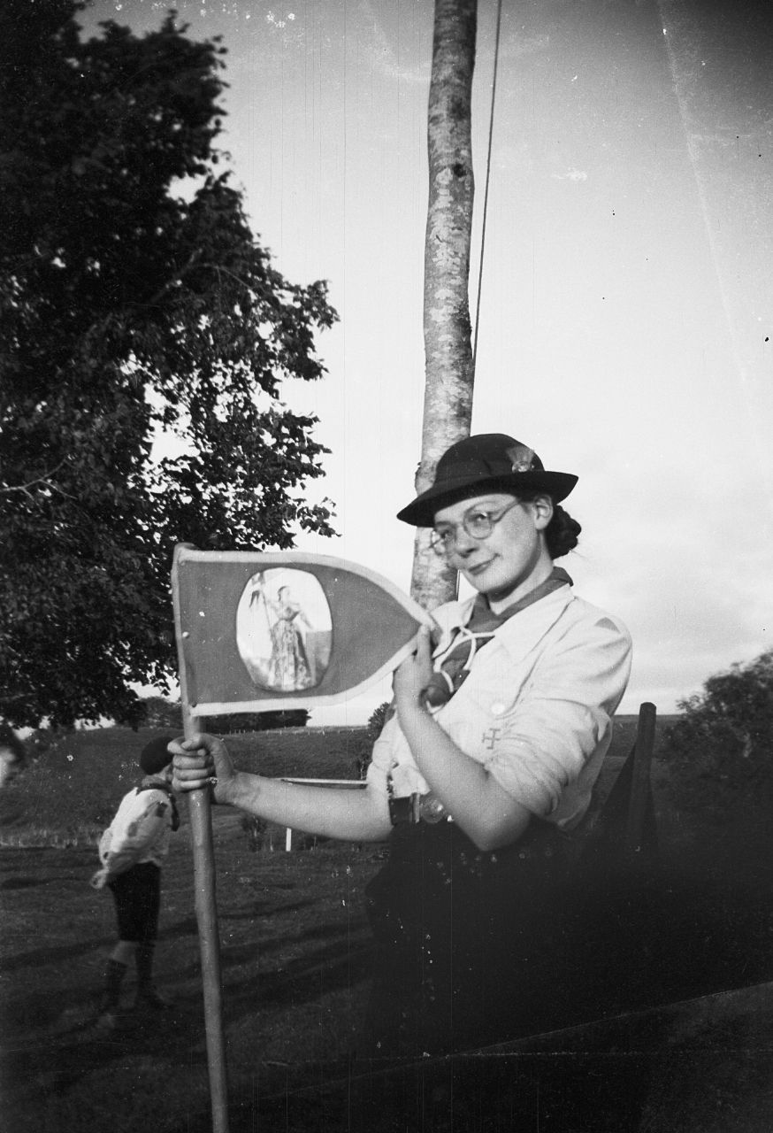 110 Fi 55, Jeune femme scout tenant une bannière à l'effigie de Jeanne d'Arc.