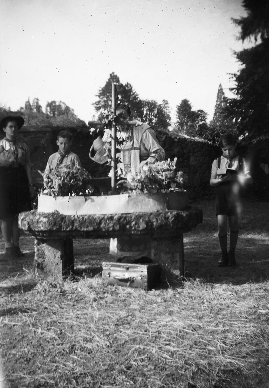 110 Fi 71, Prêtre célébrant la messe en extérieur sur un autel en pierre.