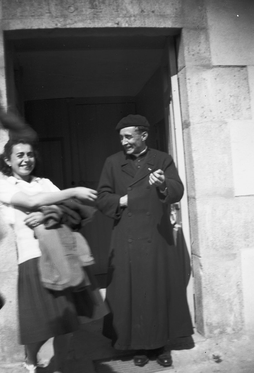 110 Fi 86, Une jeune femme et un prêtre à l'entrée d'une maison.