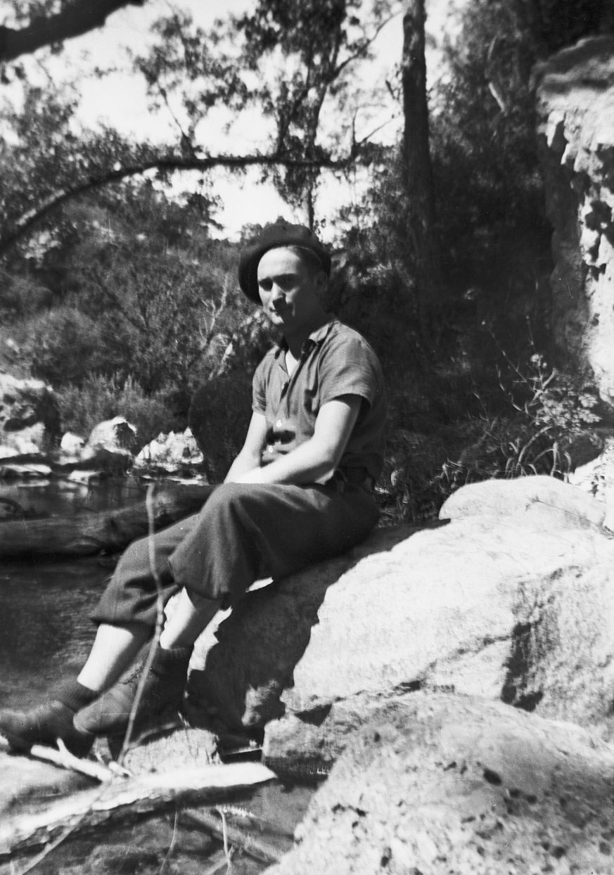 110 Fi 111, Jeune homme prenant la pose assis au bord d'une rivière.
