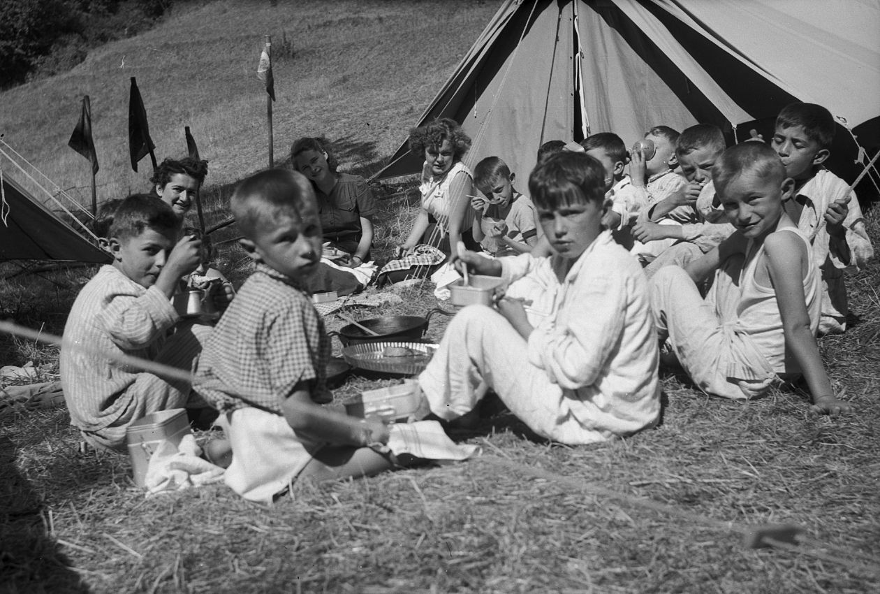 110 Fi 140, Groupe de jeunes scouts et leurs monitrices lors du petit-déjeuner au camp.