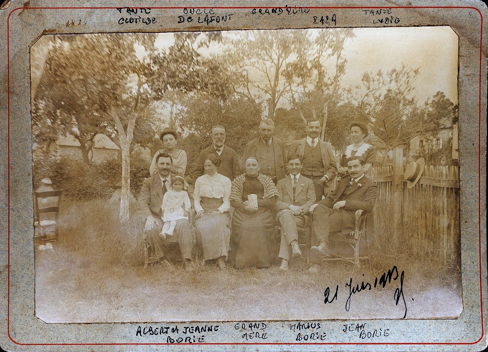 115 FI 91 - Photographie de groupe prise à Jussac : debout de gauche à droite, tante Clotilde, oncle de Lafont, Antoine Dejou, Théodore Dejou, tante Lydie ; assis de gauche à droite, Albert et Jeanne Borie, Elisa Dejou-Borie, Marius Borie, Jean Borie. - 21 juin 1913