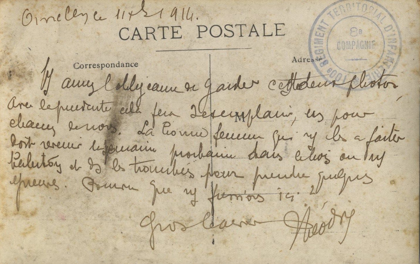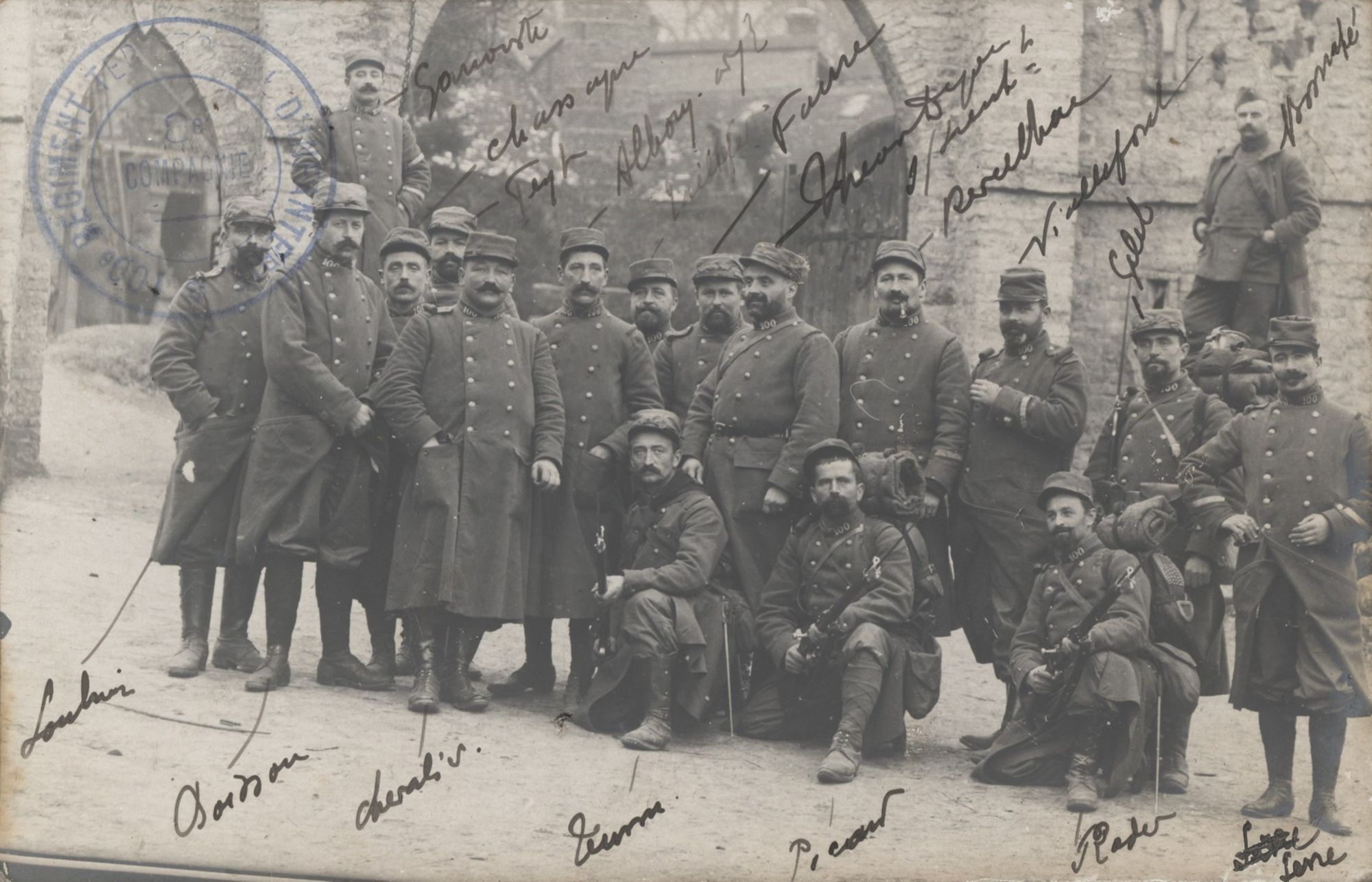 115 FI 136, Photographie de groupe de la 8e compagnie du 100e régiment territorial d'infanterie à Orvillers (Oise).