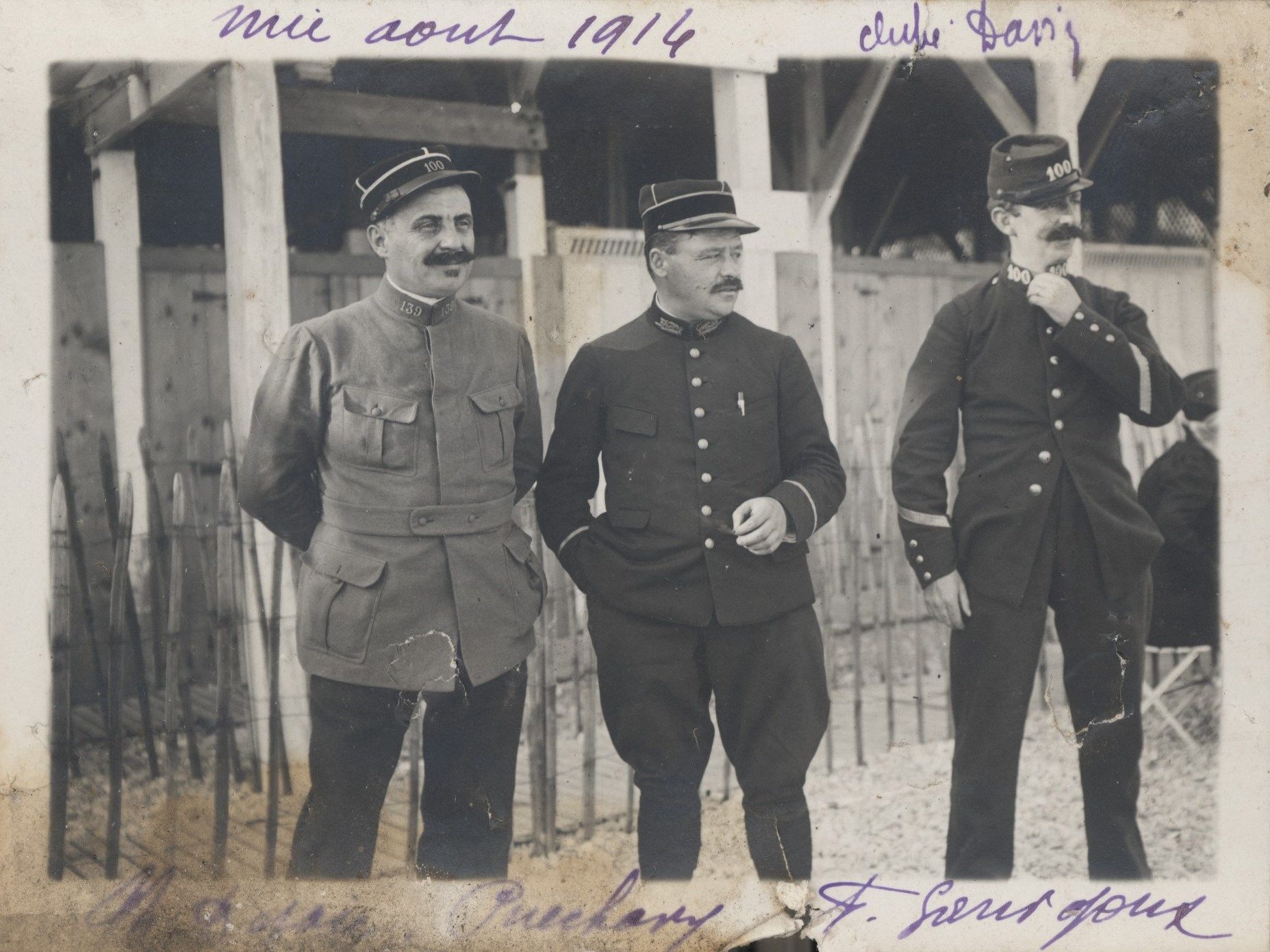 115 FI 142, Théodore Dejou avec deux autres soldats du 100e régiment d'infanterie peu après la mobilisation.