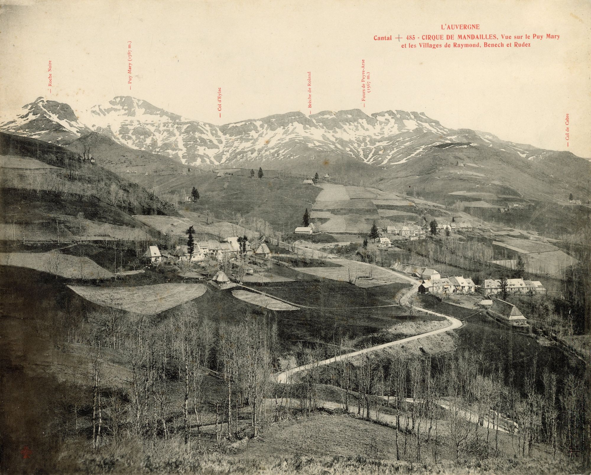 118 Fi 6, "L'Auvergne - Cantal - 485 - Cirque de Mandailles, vue sur le Puy Mary et les villages de Raymond, Benech et Rudez".