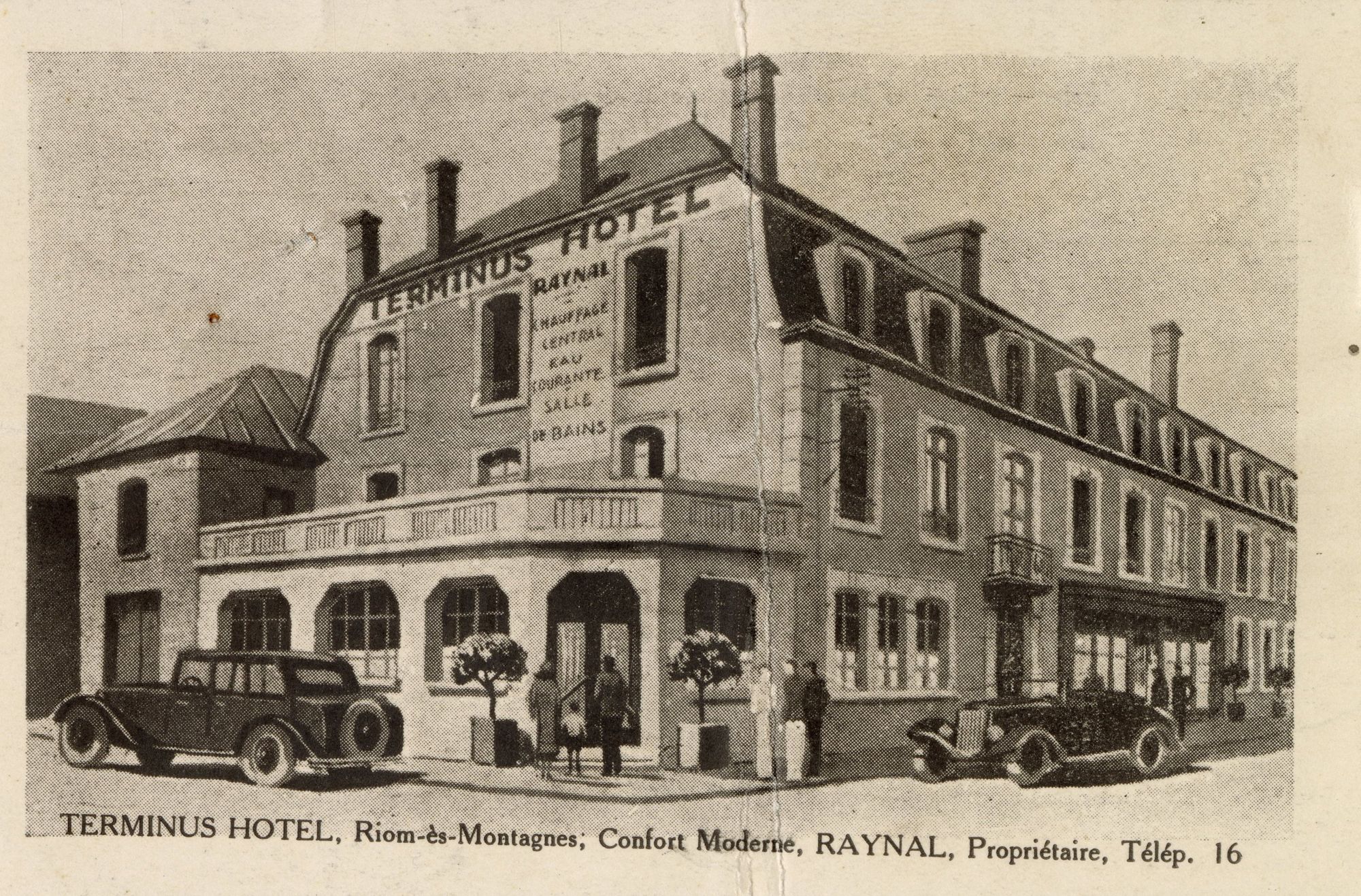117 Fi 310, "Terminus Hotel, Riom-ès-Montagnes, confort Moderne, Raynal, propriétaire". - Cliché et impression Jean Viers, Riom-ès-Montagnes (Cantal).