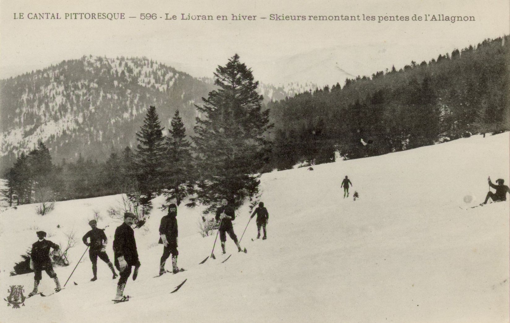 18 Fi 1464, "Le Cantal pittoresque - 596 - Le Lioran en hiver - Skieurs remontant les pentes de l'Allagnon".