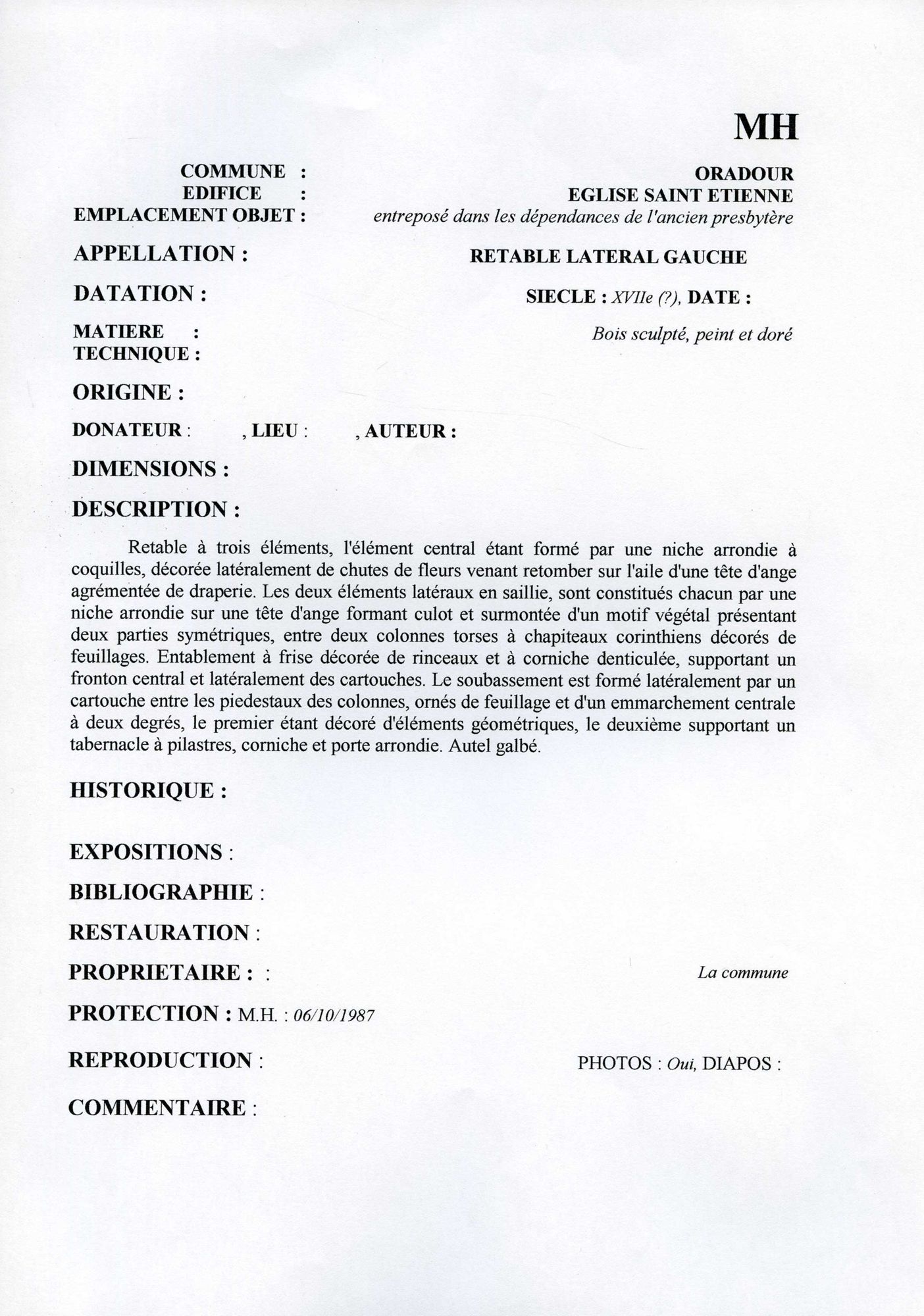 Retable latéral gauche, entreposé dans les dépendances de l'ancien presbytère, bois sculpté, peint et doré