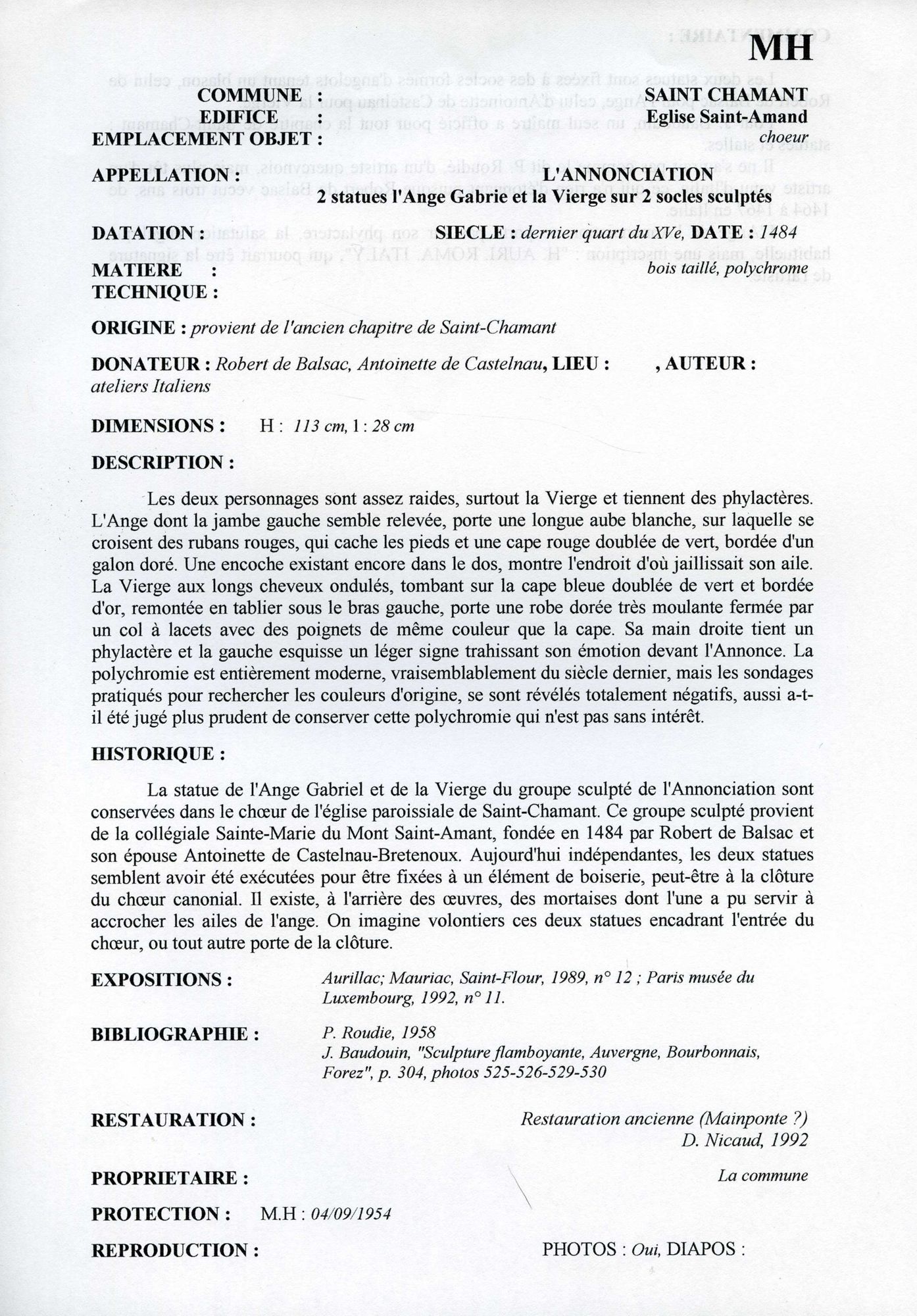 Vierge de l'Annonciation, statue, bois polychrome, Ange de l'Annonciation, statue, bois polychrome (provient du chapitre de Saint Chamant)
