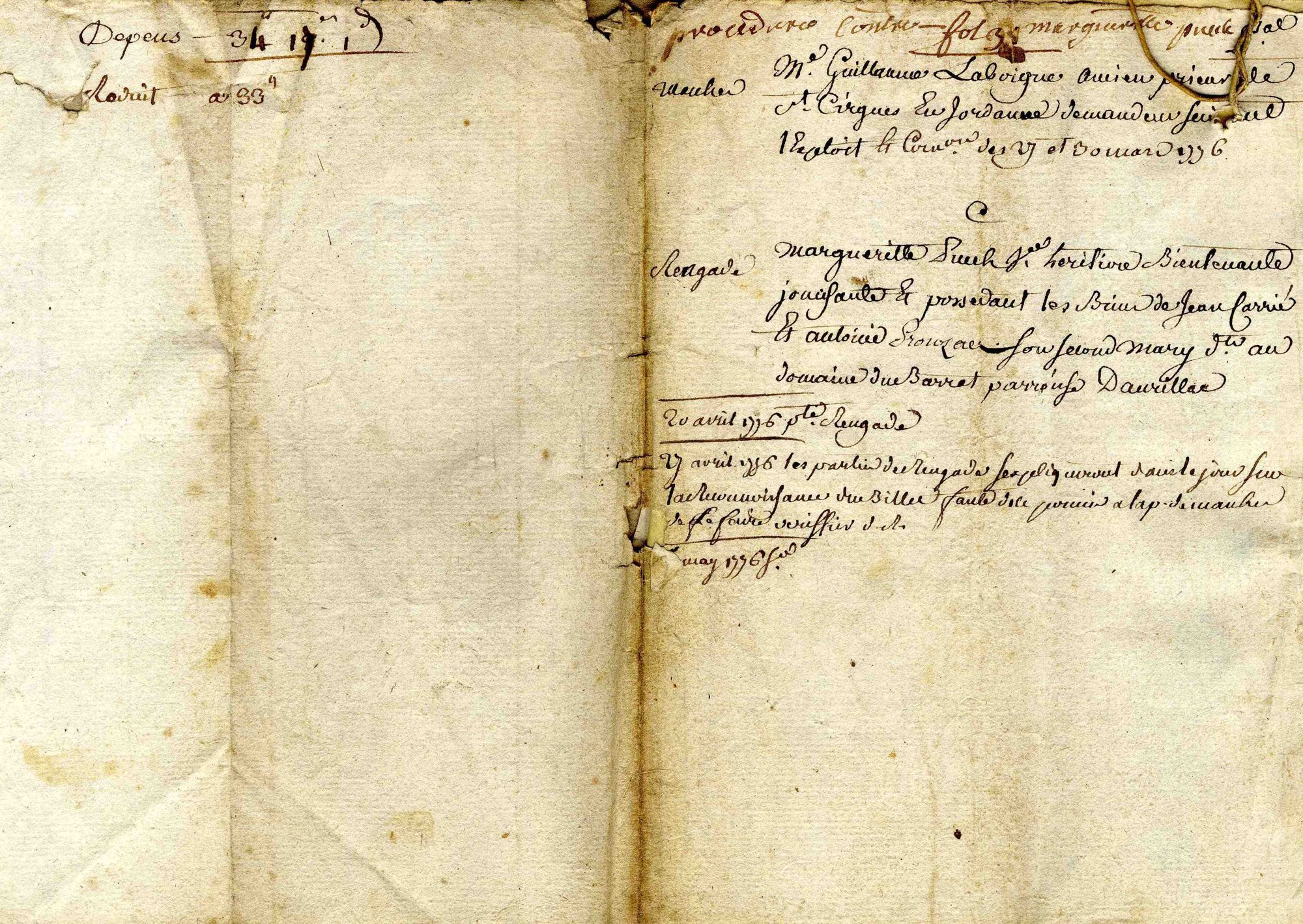 42 NUM 1-15 - Collection Géraud Cazard - 1545-[1840] Famille Carrier 42 NUM 5 - Procès, en 1770, entre Guillaume Labouigue, prieur-curé de Saint-Cirgues de Jordanne, et Marguerite Puech, veuve de Jean Carrier et épouse en secondes noces d'Antoine Pronzac (ou Bronzac), pour non-paiement de dette - 1770-1776 Cote 42 NUM 5 Date 1770-1776 Mots-clés lieu Saint-Cirgues-de-Jordanne (Cantal, France) Mots-clés matière Procès Prieur Curé Mots-clés personne Labouigue, Guillaume Puech, Marguerite Carrier, Jean Pronzac, Antoine Bronzac, Antoine Carrier (famille) Permalien de la notice https://archives.cantal.fr:443/ark:16075/a0113825108411vc8QI.moteur=arko_default_5fe0d0b5a0d5e