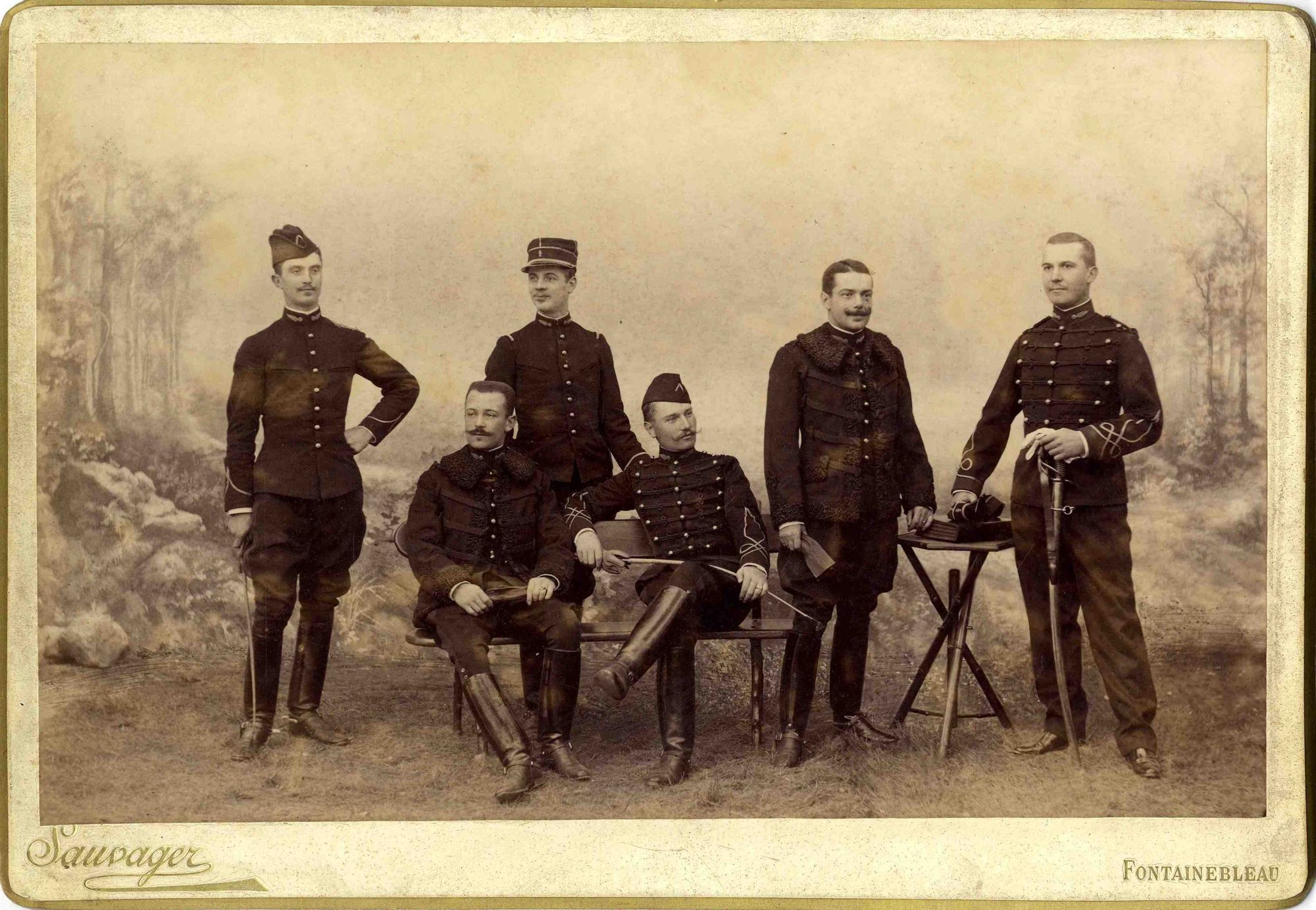 Grande Collecte Général Jean BRUNON, spécialiste du renseignement militaire et gouverneur militaire de Verdun Photographies Elèves officiers à l'école d'application de l'artillerie et du génie de Fontainebleau. Assis de gauche à droite : Jean Brunon et Pierre de Roquemaurel. Debout de gauche à droite : De Liepvre, Des Vignes de Puylarocque, Robert et Antoine de Tarlé. Cliché Sauvager à Fontainebleau. Cote 43 NUM 1/6 Date 1894 Permalien de la notice https://archives.cantal.fr:443/ark:16075/a011372320914So8ocD.moteur=arko_default_5fe0d0b5a0d5e