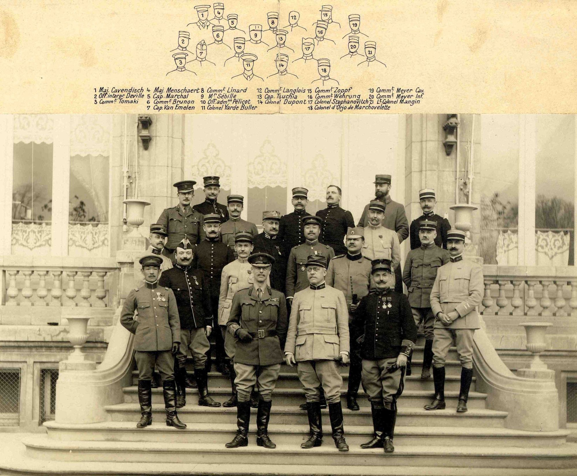 Grande Collecte Général Jean BRUNON, spécialiste du renseignement militaire et gouverneur militaire de Verdun Photographies Deuxième bureau du grand quartier général allié de Chantilly. Quatrième rang de gauche à droite : major Cavendisch, major Menschaert, capitaine Marchal, commandant Linard, commandant Langlois, commandant Zoppf, commandant Meyer Cav. Troisième rang de gauche à droite : officier interprète Deville, commandant Brunon, maréchal Sébille, capitaine Tsuchia, commandant Wehrung, commandant Meyer Inf. Deuxième rang de gauche à droite : capitaine Van Emelen, officier Pélicot, colonel Stephanovitch, lieutenant-colonel Mangin. Premier rang de gauche à droite : commandant Tomaki, colonel Yarde Buller, colonel Dupont, colonel D'Orjo de Marchovelette. Cote 43 NUM 1/10 Date 1915 Permalien de la notice https://archives.cantal.fr:443/ark:16075/a011372320914re3T6d.moteur=arko_default_5fe0d0b5a0d5e