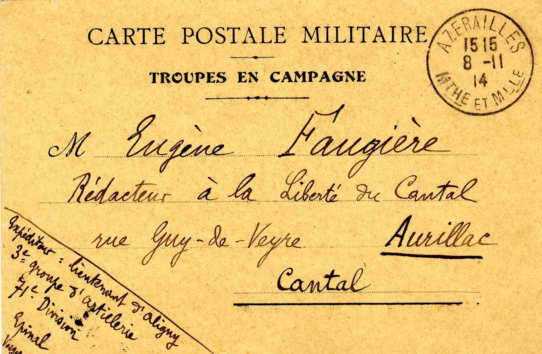 Grande Collecte Général Jean BRUNON, spécialiste du renseignement militaire et gouverneur militaire de Verdun Correspondance Lettre du lieutenant d'Aligny, 3e groupe d'artillerie, 71e division d'Epinal, à Eugène Faugière (8 novembre 1914). Cote 43 NUM 1/18 Date 1914 Permalien de la notice https://archives.cantal.fr:443/ark:16075/a0113723209141zM8Ww.moteur=arko_default_5fe0d0b5a0d5e