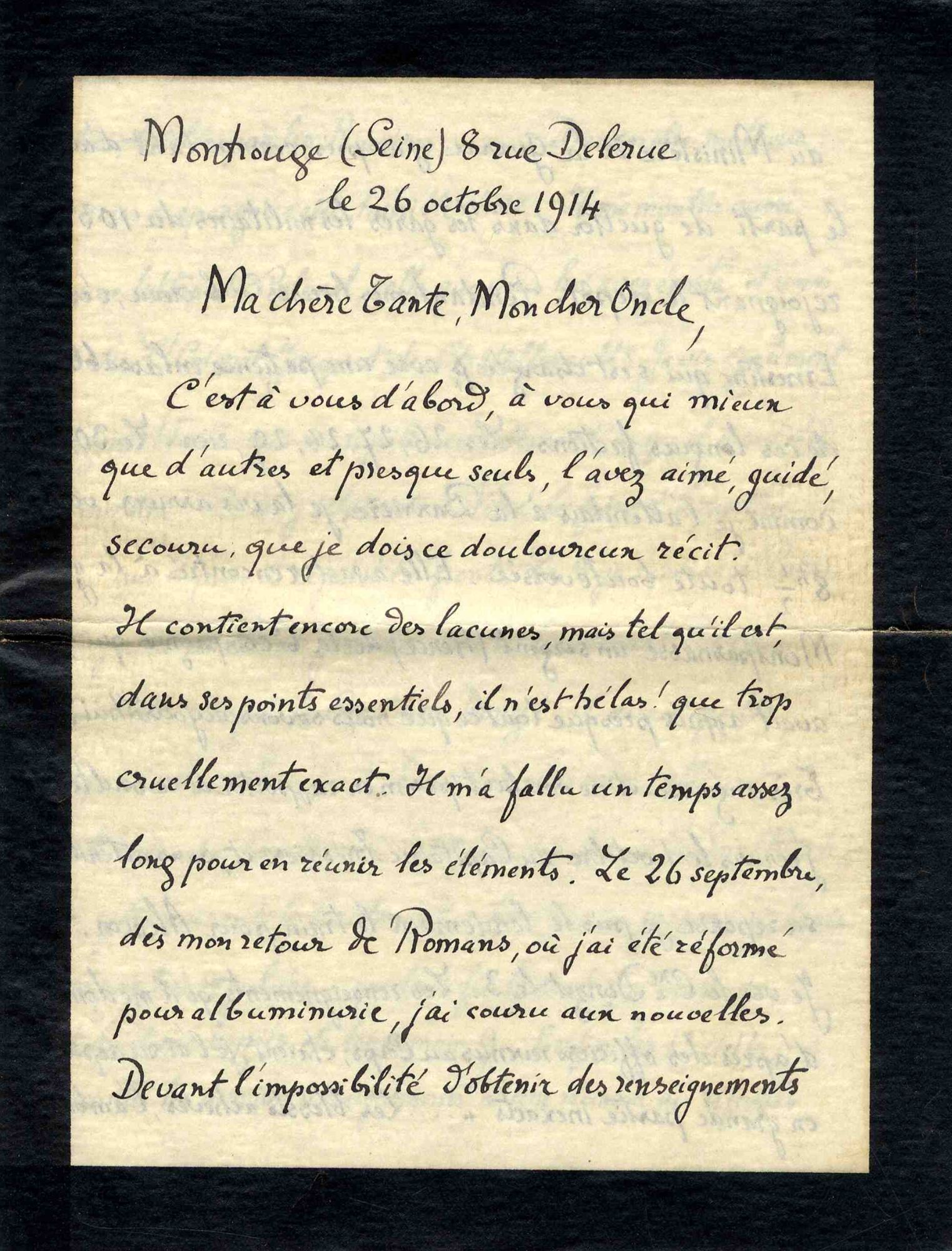 Grande Collecte Général Jean BRUNON, spécialiste du renseignement militaire et gouverneur militaire de Verdun Correspondance Lettre de Charles Faugière (neveu de Marie-Charlotte Faugière et de Eugène Faugière, cousin de Jean Brunon), qui concerne la mort de son frère Emile Faugière, capitaine d'infanterie au 103e régiment, mort le 24 août 1914. Cote 43 NUM 1/19 Date 1914 Permalien de la notice https://archives.cantal.fr:443/ark:16075/a011372320914uJUF3d.moteur=arko_default_5fe0d0b5a0d5e