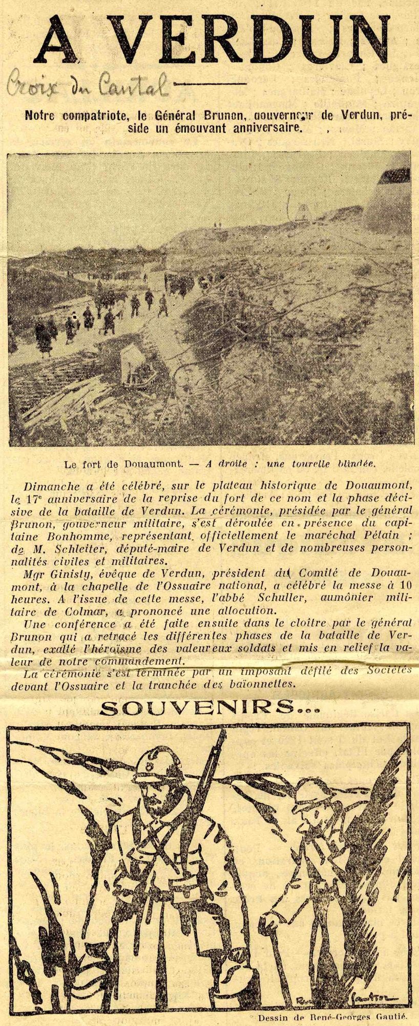 Grande Collecte Général Jean BRUNON, spécialiste du renseignement militaire et gouverneur militaire de Verdun Coupures de presse La Croix du Cantal : célébration du 17e anniversaire de la reprise du Fort de Douaumont, cérémonie présidée par le général Brunon. Cote 43 NUM 1/24 Date 1933 Permalien de la notice https://archives.cantal.fr:443/ark:16075/a0113723209142158Lw.moteur=arko_default_5fe0d0b5a0d5e
