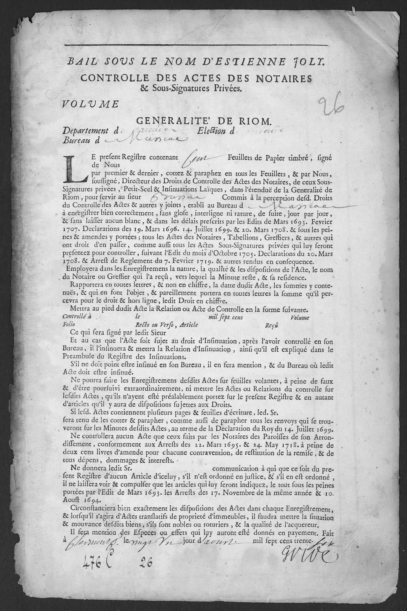Série C - Contrôle des actes - 1676-1822 Bureau de Massiac Contrôle des actes de notaires et sous seing privé (1703-1791) 4 nov. 1736 - 12 janv. 1738 - 1736-1738 Cote 476 C 26 Date 1736-1738 Description physique Registre : Oui Permalien de la notice https://archives.cantal.fr:443/ark:16075/a011354695718L3YG2Z.moteur=arko_default_5fe0d0b5a0d5e