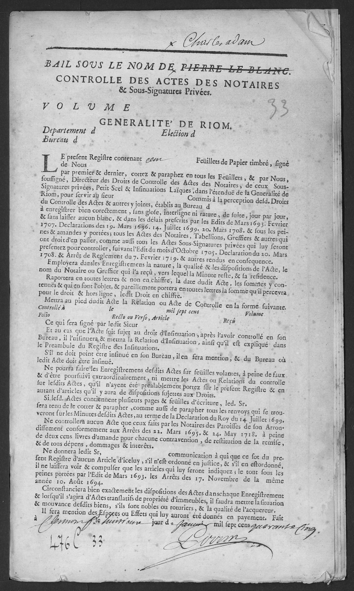 Série C - Contrôle des actes - 1676-1822 Bureau de Massiac Contrôle des actes de notaires et sous seing privé (1703-1791) 7 août 1745 - 6 déc. 1746 - 1745-1746 Cote 476 C 33 Date 1745-1746 Description physique Registre : Oui Permalien de la notice https://archives.cantal.fr:443/ark:16075/a011354695718JCQxDm.moteur=arko_default_5fe0d0b5a0d5e