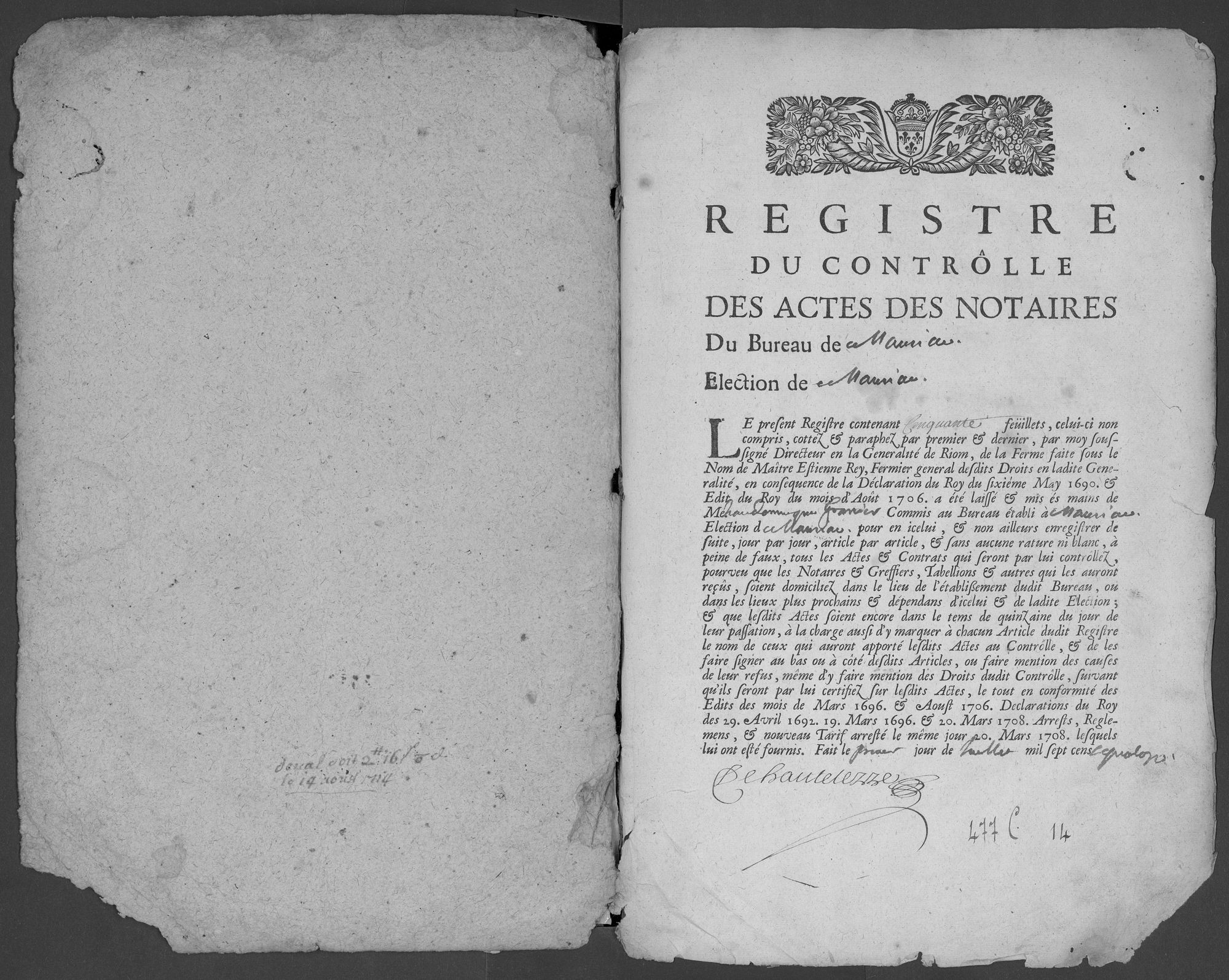 Série C - Contrôle des actes - 1676-1822 Bureau de Mauriac Contrôle des actes de notaires et sous seing privé (1693-1789) 2 juill. 1714 - 1er déc. 1715 - 1714-1715 Cote 477 C 14 Date 1714-1715 Description physique Registre : Oui Permalien de la notice https://archives.cantal.fr:443/ark:16075/a011354695718Jlxny1.moteur=arko_default_5fe0d0b5a0d5e