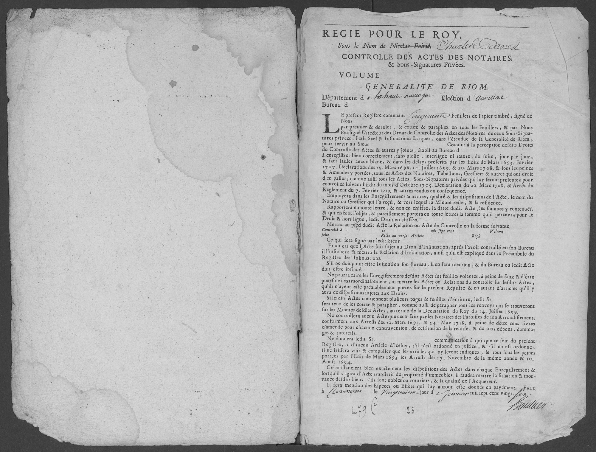 Série C - Contrôle des actes - 1676-1822 Bureau de Montsalvy Contrôle des actes de notaires et sous seing privé (1693-1790) 28 déc. 1726 - 13 août 1727 - 1726-1727 Cote 479 C 23 Date 1726-1727 Description physique Registre : Oui Permalien de la notice https://archives.cantal.fr:443/ark:16075/a011354695718qBnE5C.moteur=arko_default_5fe0d0b5a0d5e