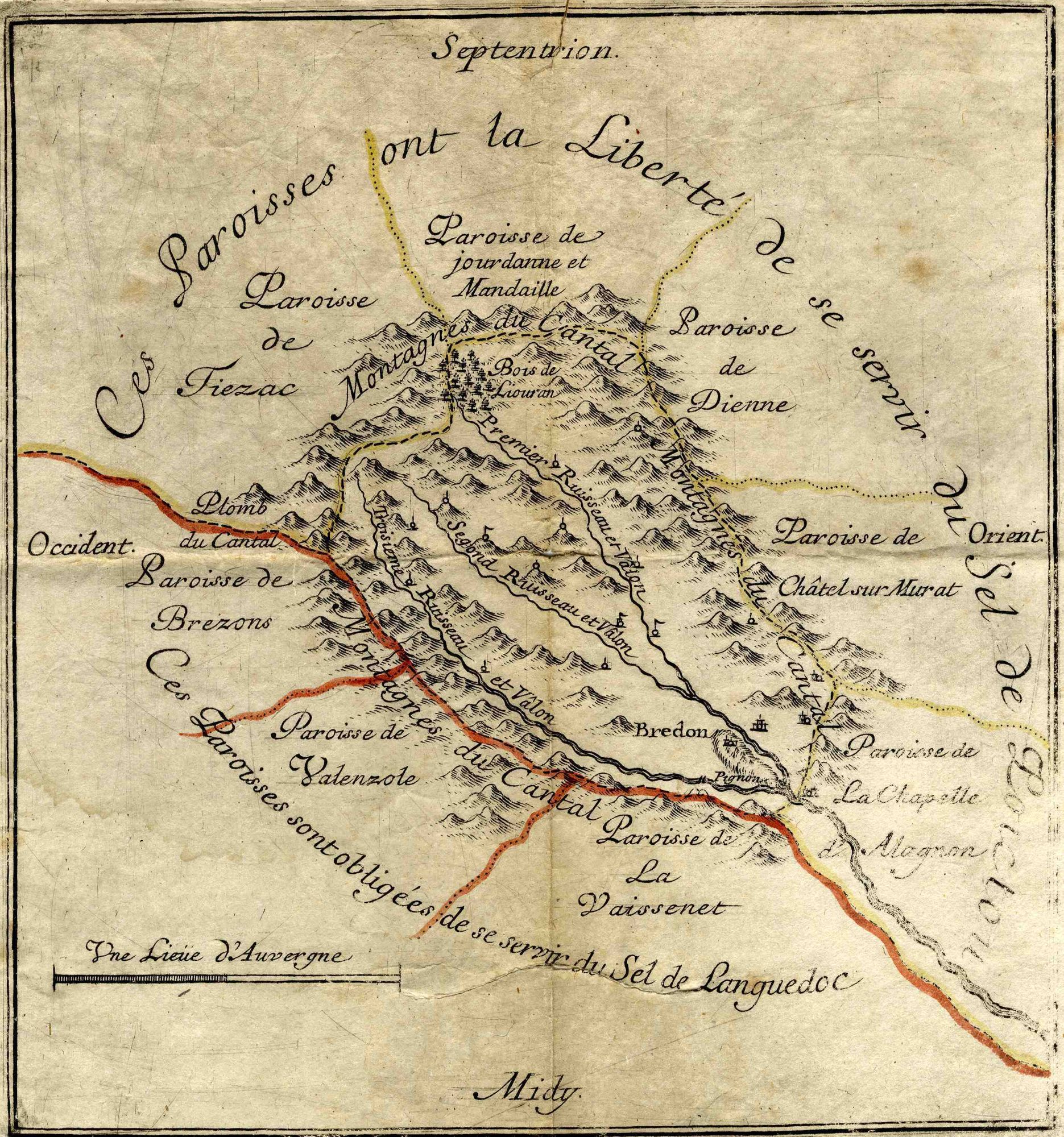 Le roi Charles VIII, par un édit du 24 octobre 1493 (9 B 1. Déjà Charles VII aurait établi la même limite en 1453) servant de règlement pour les gabelles du Languedoc, avait ordonné que le sel de Languedoc aurait cours dans "le pays d'Auvergne jusqu'aux rivières d'Alaignon et de Jordanne". La Haute-Auvergne traversée par la frontière séparant les pays de "petite gabelle" de Languedoc, des pays rédimés, devenait un lieu propice aux contestations (ainsi la paroisse de Bredons plaida-t-elle longtemps pour se faire reconnaître rédimée, cf. 9 B 1) et au faux-saunage.