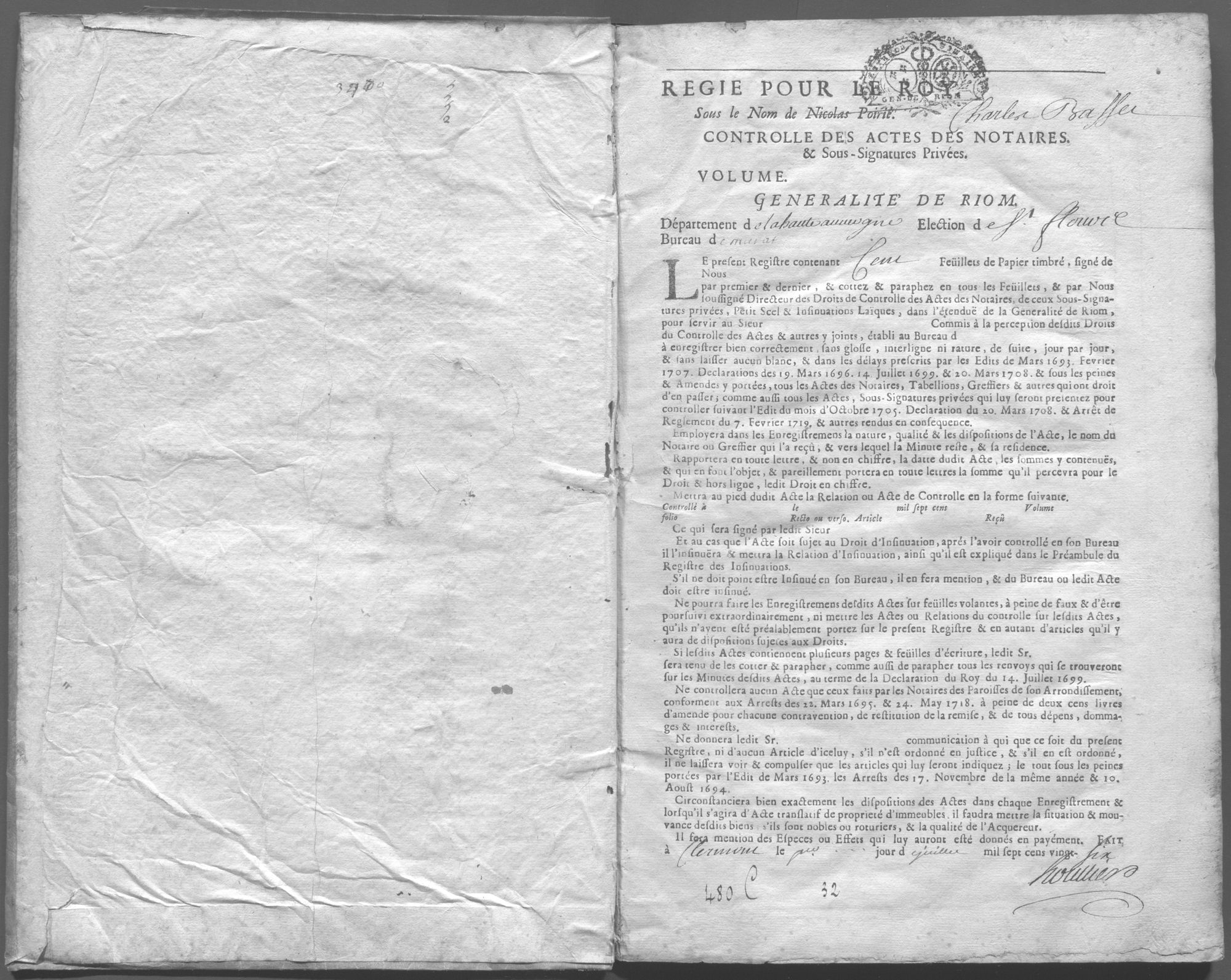 Série C - Contrôle des actes - 1676-1822 Bureau de Murat Contrôle des actes de notaires et sous seing privé (1699-1791) 2 déc. 1726 - 26 sept. 1727 - 1726-1727 Cote 480 C 32 Date 1726-1727 Description physique Registre : Oui Permalien de la notice https://archives.cantal.fr:443/ark:16075/a011354695718RchO4O.moteur=arko_default_5fe0d0b5a0d5e