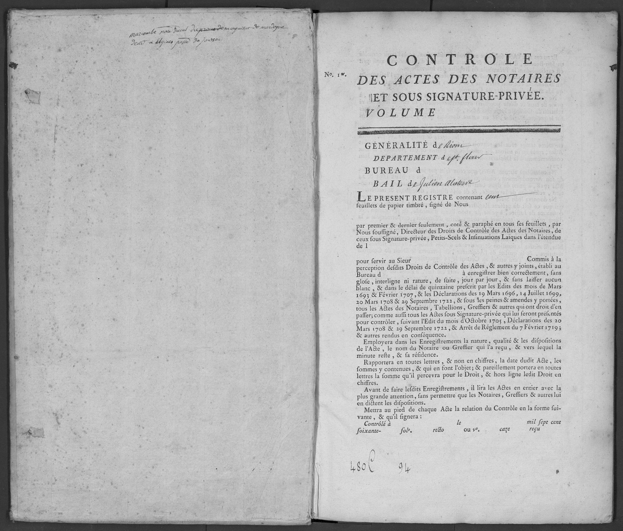 Série C - Contrôle des actes - 1676-1822 Bureau de Murat Contrôle des actes de notaires et sous seing privé (1699-1791) 22 mai 1770 - 17 janv. 1771 - 1770-1771 Cote 480 C 94 Date 1770-1771 Description physique Registre : Oui Permalien de la notice https://archives.cantal.fr:443/ark:16075/a011354695718dt4QGT.moteur=arko_default_5fe0d0b5a0d5e