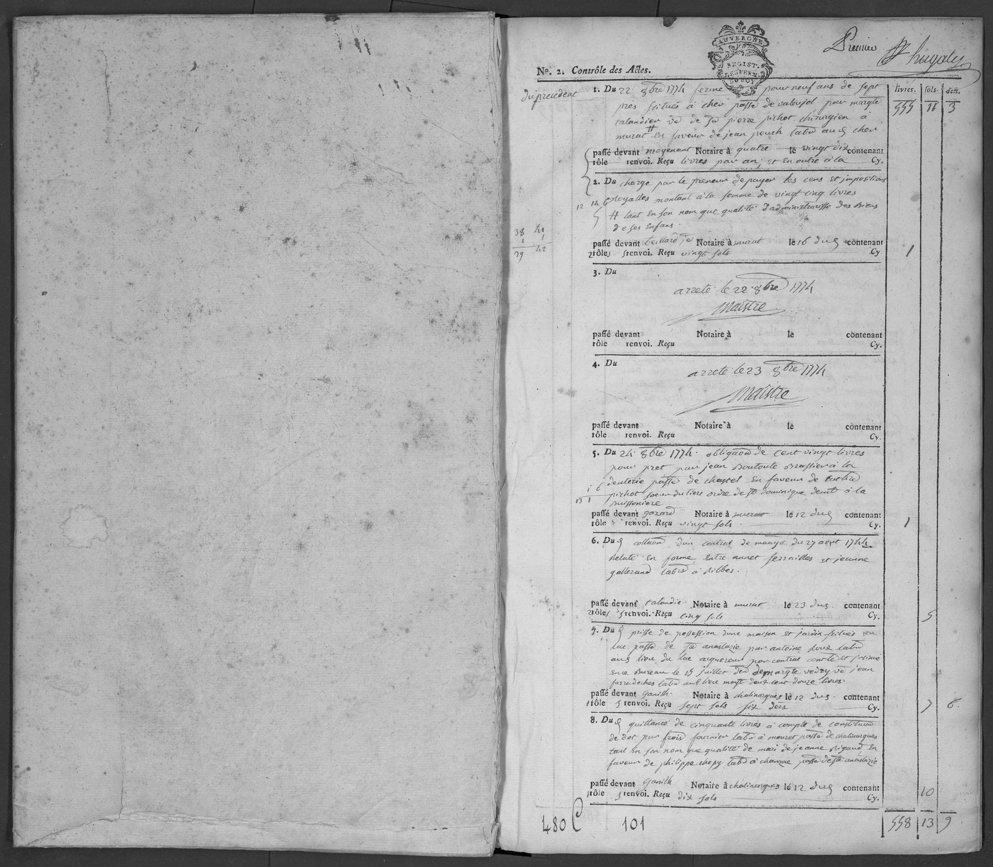 Série C - Contrôle des actes - 1676-1822 Bureau de Murat Contrôle des actes de notaires et sous seing privé (1699-1791) 22 oct. 1774 - 3 juill. 1775 - 1774-1775 Cote 480 C 101 Date 1774-1775 Description physique Registre : Oui Permalien de la notice https://archives.cantal.fr:443/ark:16075/a011354695718ZG2Hys.moteur=arko_default_5fe0d0b5a0d5e