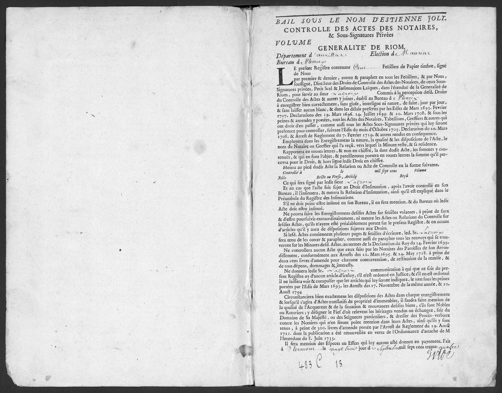 Série C - Contrôle des actes - 1676-1822 Bureau de Pleaux Contrôle des actes de notaires et sous seing privé (1697-1792) 1er oct. 1734 - 19 déc. 1735 - 1734-1735 Cote 483 C 13 Date 1734-1735 Description physique Registre : Oui Permalien de la notice https://archives.cantal.fr:443/ark:16075/a011354695718Blcvgn.moteur=arko_default_5fe0d0b5a0d5e