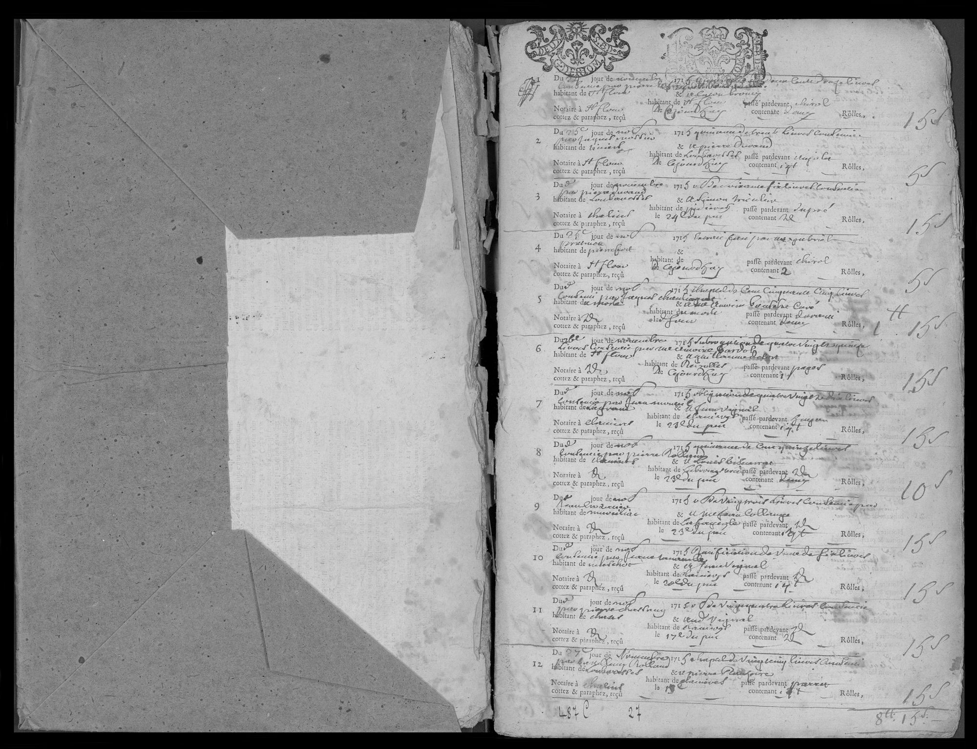 Série C - Contrôle des actes - 1676-1822 Bureau de Saint-Flour Contrôle des actes de notaires et sous seing privé (1698-1790) 24 nov. 1715 - 4 mars 1716 - 1715-1716 Cote 487 C 27 Date 1715-1716 Description physique Registre : Oui Permalien de la notice https://archives.cantal.fr:443/ark:16075/a01135470034931ib73.moteur=arko_default_5fe0d0b5a0d5e
