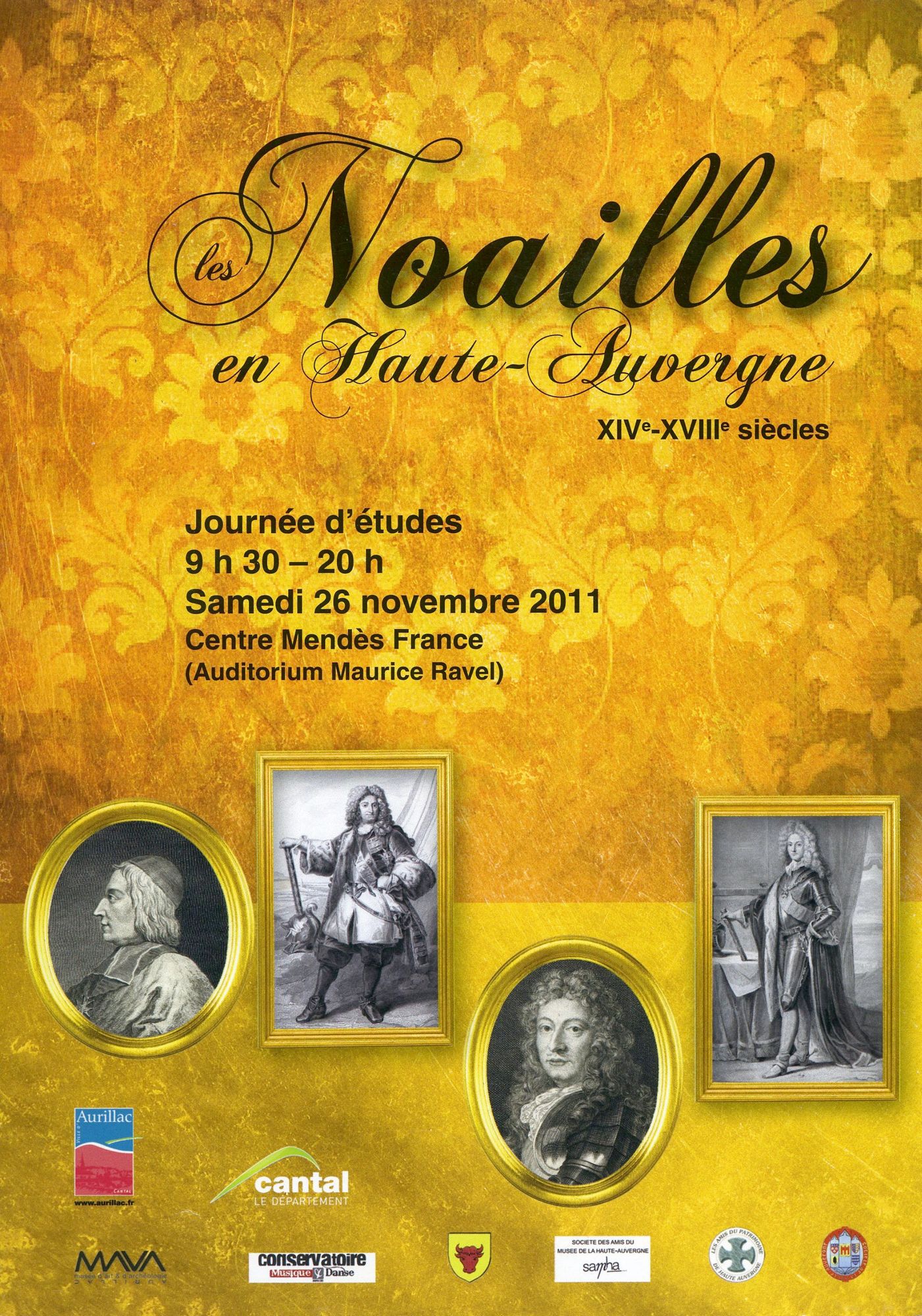 Le samedi 26 novembre 2011, de 9 h 30 à 20 h, le Conseil général du Cantal et la Ville d'Aurillac ont organisés à l'auditorium Maurice Ravel du Conservatoire de musique et de danse, une journée d'études, suivie d'un spectacle de musique et de danse, pour évoquer la présence et l'action de la famille de Noailles en Haute-Auvergne. Originaire du Limousin, cette famille noble acquiert peu-à-peu des biens en Haute-Auvergne, à partir du XIVe siècle. Elle y occupe une place éminente dans les domaines judiciaires, militaires, seigneuriaux, religieux, architecturaux. Parvenu, à partir des années 1660, au sommet des honneurs de la Cour (ducs et pairs, les Noailles deviennent maréchaux de France, ambassadeurs, ministres, cardinaux), elle conserve, jusqu'à la Révolution, des biens dans le Cantal.