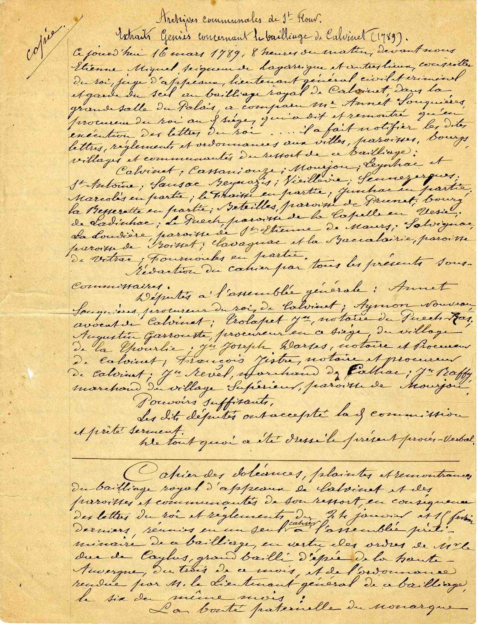 Copie du début XXème siècle. Extrait de Geniès des archives municipales de Saint-Flour, concernant le bailliage de Calvinet. Manuscrit.