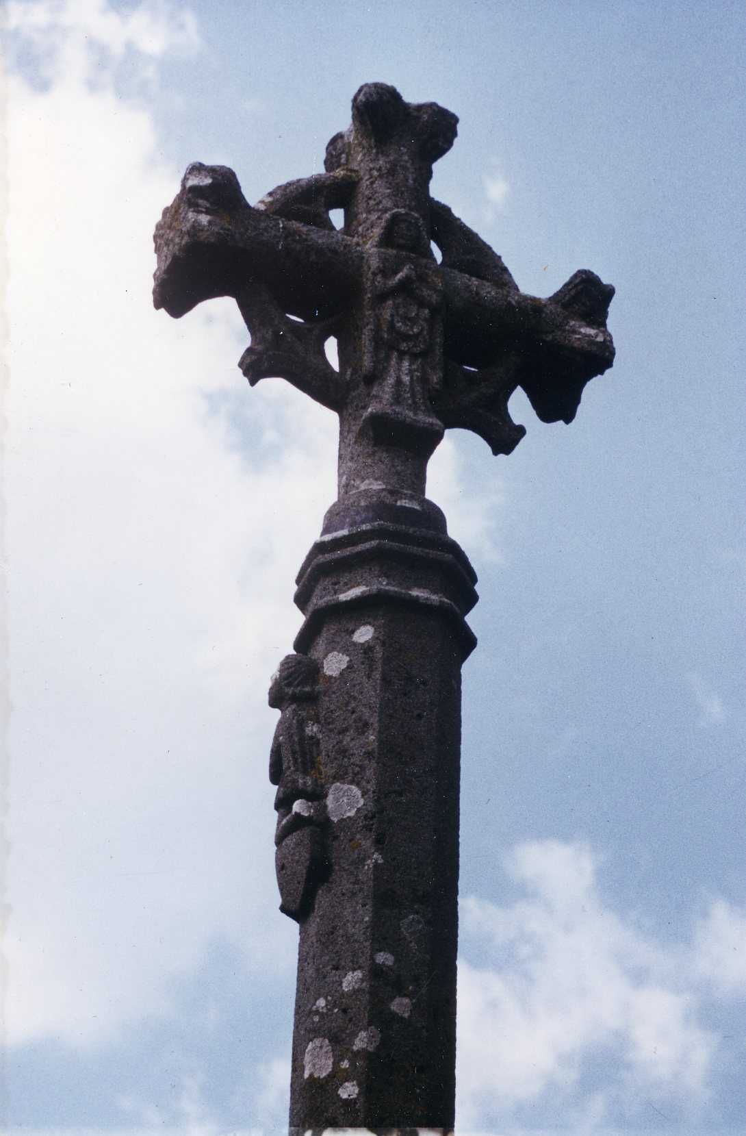 Iconographie : Vierge orante ; sur le fût, personnage agenouillé sur un petit écu lisse, représentant un berger ou probablement un donateur comme tend à l'indiquer l'écu