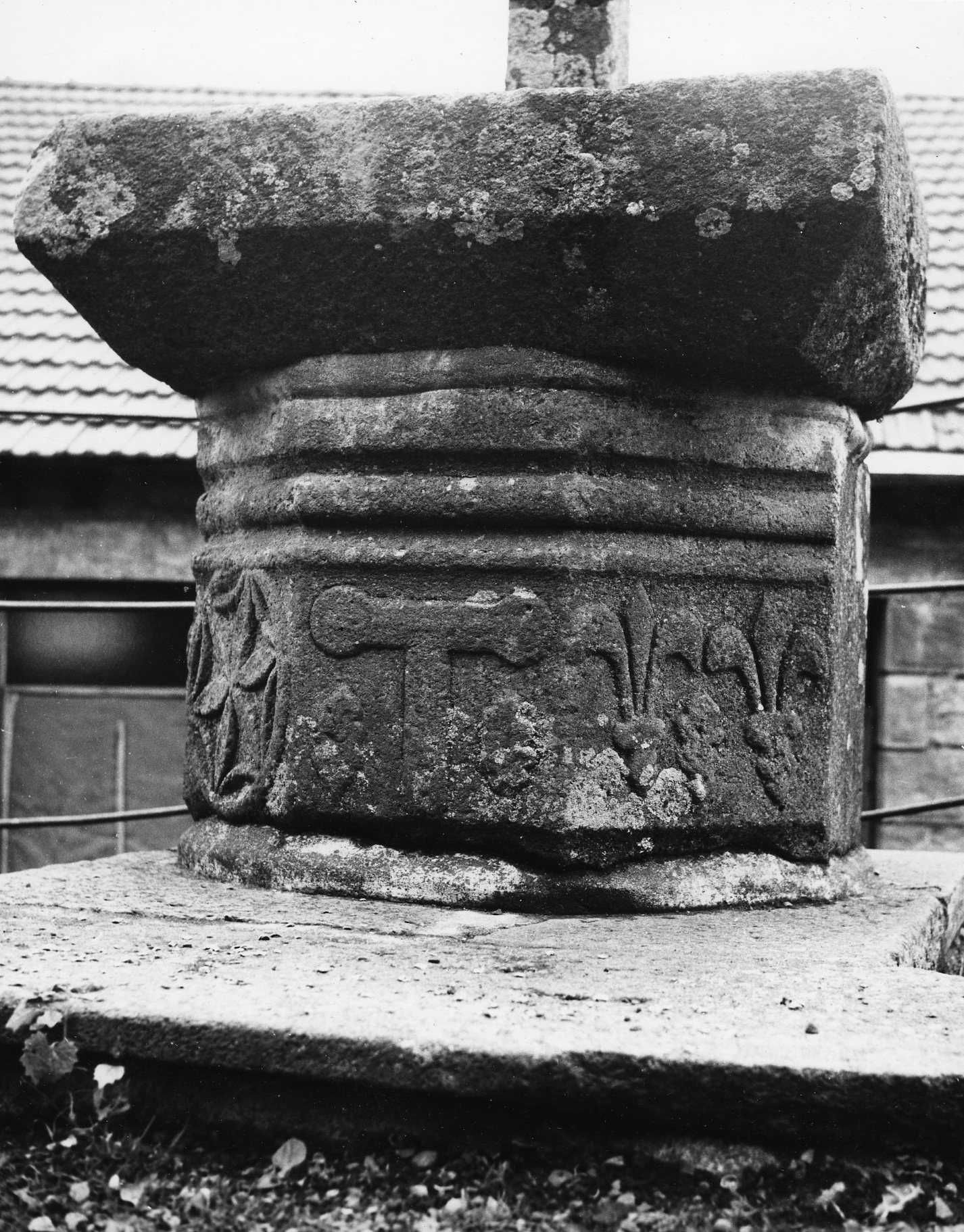 Iconographie : rosace à six branches, tau encadré par des feuilles et fleurs de lis.