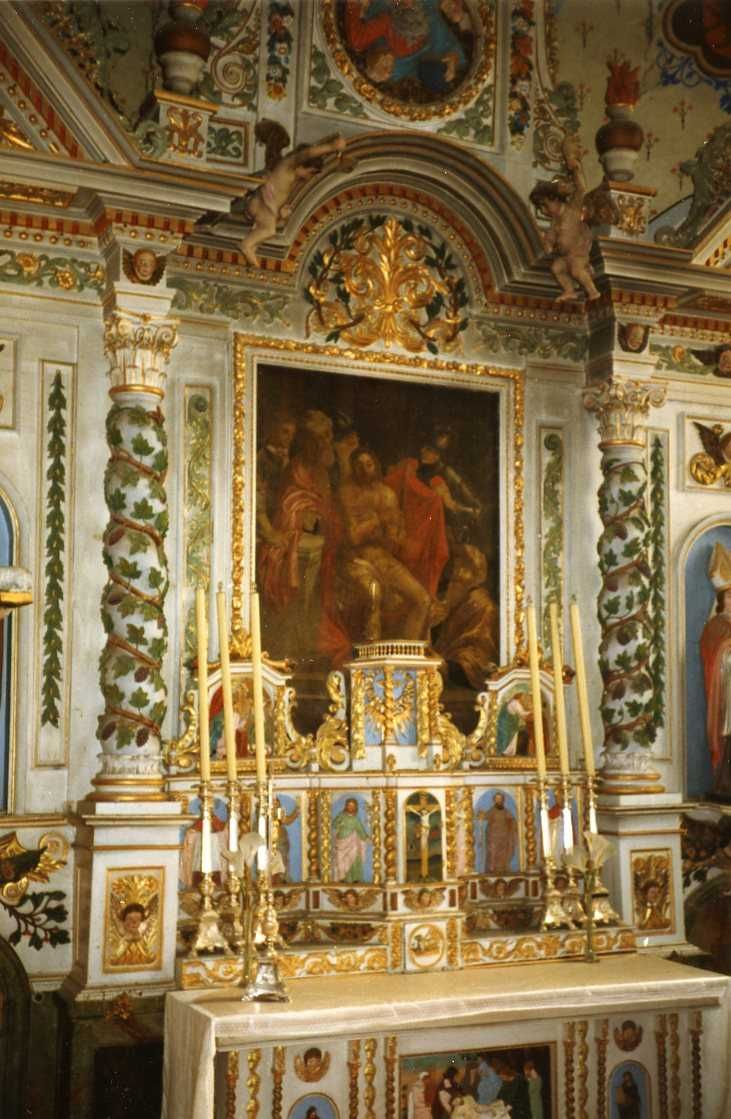 Historique : Le retable, contemporain du maître-autel, date de la fin du XVIIe siècle ou du début du XVIIIe siècle ; l'autel, en revanche, semble avoir été exécuté au XIXe siècle avec un motif ornemental inspiré de la première moitié du XVIIIe siècle.