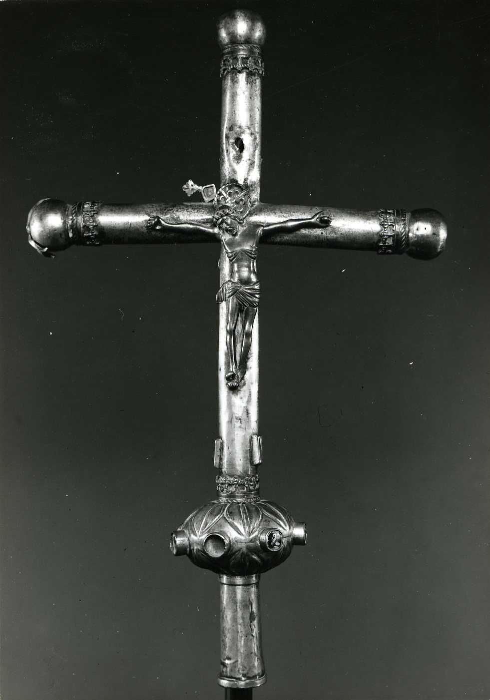 Précision représentation : noeud : sept feuilles d'eau en haut et en bas, et sept boutons, ornés d'un même profil gauche masculin, barbu, en émail peint, camaïeu bleu, blanc et gris (quatre sont conservés, d'un cinquième subsiste le fond, les deux autres ont disparu) ; avers : Christ en croix ; revers : Vierge à l'Enfant à l'opposé du Christ, sous un dais, distinct, et Tétramorphe incomplet : Lion de saint Marc sur le bras gauche, phylactère : MARCUS ; boeuf de saint Luc en haut du montant, phylactère : LUCAS ; Homme de saint Matthieu sur le bras droit ; pas de décor écoté ni de gravure en spirale sur le montant et la traverse