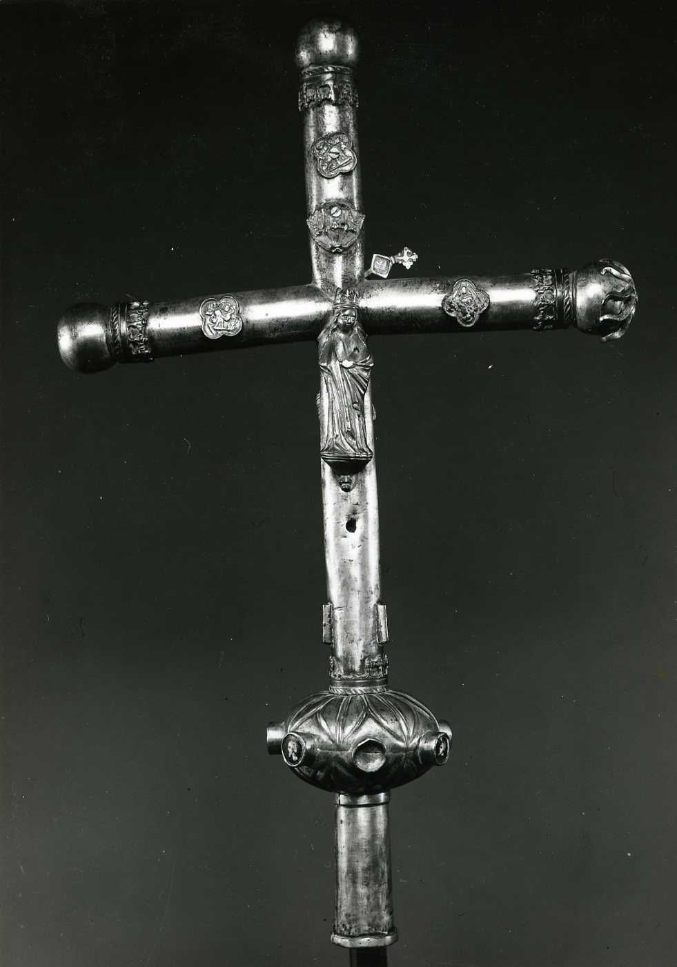 Précision représentation : noeud : sept feuilles d'eau en haut et en bas, et sept boutons, ornés d'un même profil gauche masculin, barbu, en émail peint, camaïeu bleu, blanc et gris (quatre sont conservés, d'un cinquième subsiste le fond, les deux autres ont disparu) ; avers : Christ en croix ; revers : Vierge à l'Enfant à l'opposé du Christ, sous un dais, distinct, et Tétramorphe incomplet : Lion de saint Marc sur le bras gauche, phylactère : MARCUS ; boeuf de saint Luc en haut du montant, phylactère : LUCAS ; Homme de saint Matthieu sur le bras droit ; pas de décor écoté ni de gravure en spirale sur le montant et la traverse