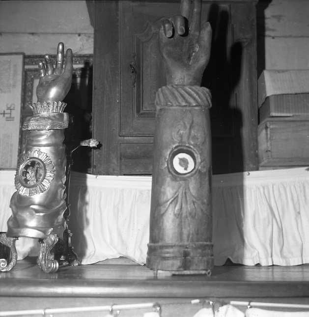 Description : Bras reliquaire, main droite bénissante, trois premiers doigts ouverts, les deux autres légèrement repliés, émerge d'une manche légèrement bouillonnée au poignet orné de dentelles. A mi-hauteur, fenêtre ovale entourée de rayons. Au dos, poignet pour ostension.