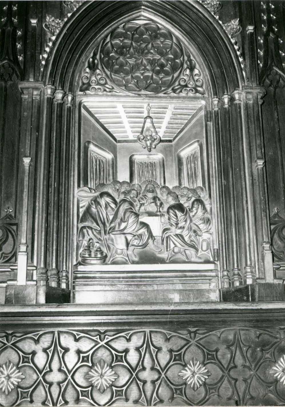 Description : Retable néo-gothique avec partie centrale à deux étages et deux parties latérales à trois étages. Partie centrale avec tabernacle, dais d'exposition à pinacle et Christ en croix au-dessous.
