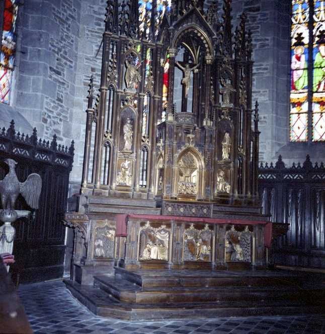 Description : Retable néo-gothique avec partie centrale à deux étages et deux parties latérales à trois étages. Partie centrale avec tabernacle, dais d'exposition à pinacle et Christ en croix au-dessous.