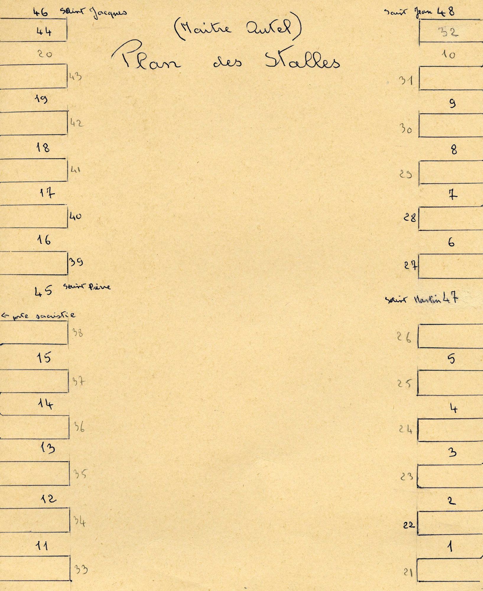 Description : Dix stalles de chaque côté du choeur. Les cinq premières ont des dossiers en voussoir et sont séparées des suivantes par une porte. Elles ont des dossiers qui forment lambris et sont séparées par des panneaux de refend sculptés.