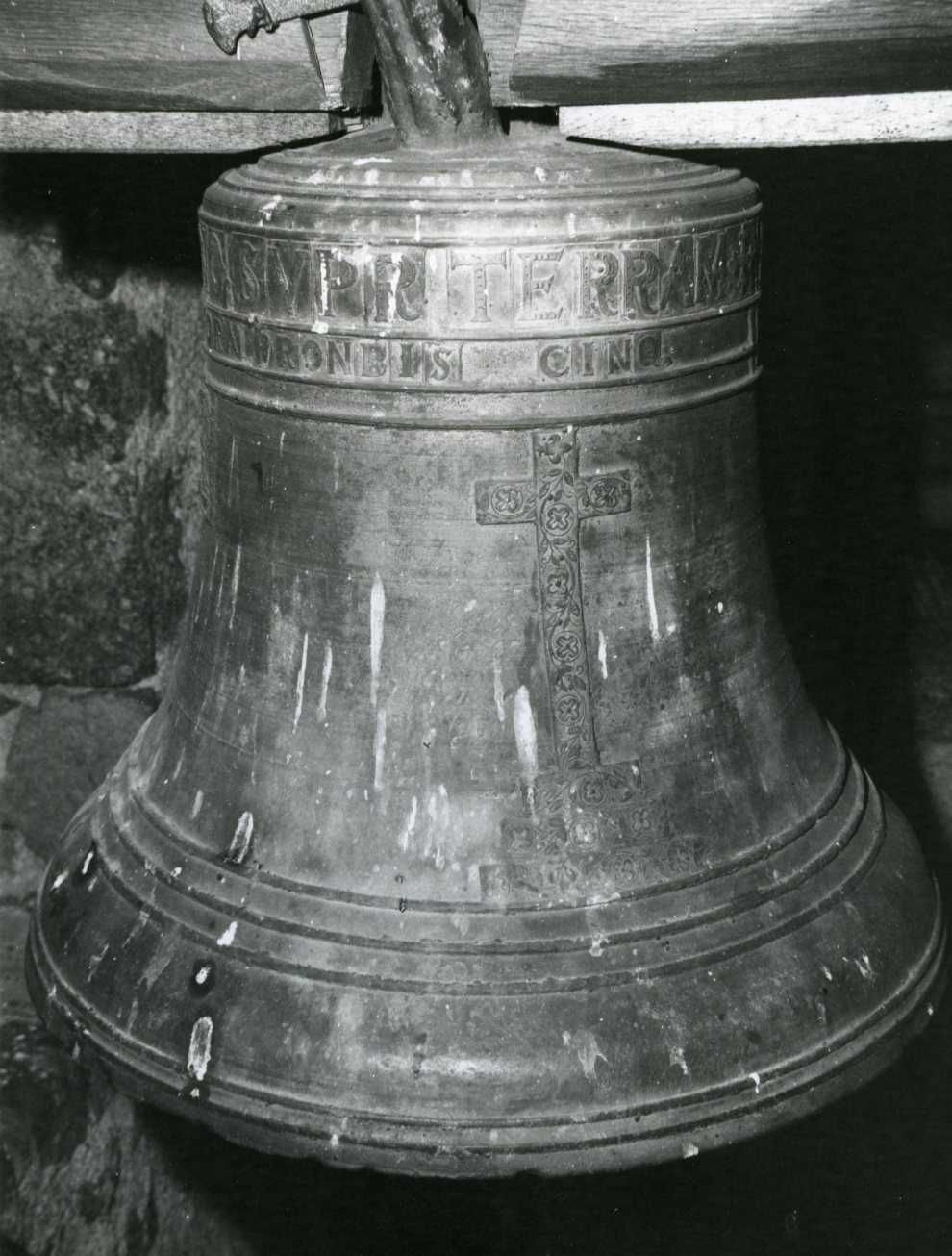 Historique : La date, ici réduite au mot CINQ dans l'inscription, peut être lue 1605, en comparaison à une cloche de même style d'une commune voisine
