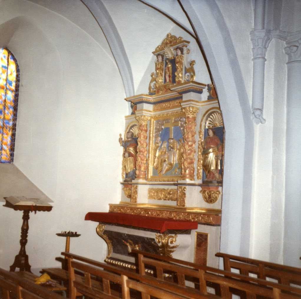 Description : Retable à trois éléments, avec un bas-relief central représentant la Descente de croix, entre deux colonnes torses en saillie à pampres et chapiteaux corinthiens, montées sur des piédestaux. Les colonnes supportent un entablement à décrochement, frise, corniche, surmonté d'un fronton comportant dans une niche une statuette du Christ aux liens, sur un socle, entre deux ailerons et des bouquets suspendus. Les deux éléments latéraux sont formés chacun d'une niche arrondie, surmontée d'une petite corniche et d'un cartouche, comportant à gauche, la statue de saint Pierre et à droite, la statue de sainte Agnès. Emmarchement à un dergé décoré d'une frise. Autel galbé.