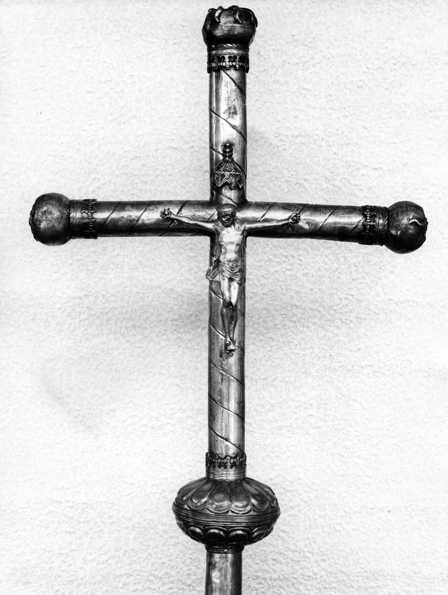 Description : Croix à section circulaire. La croix et le noeud sont rivetés, le Christ et le dais sont fondus et rivetés au montant de la croix. Les extrémités se terminent par des sphères applaties.