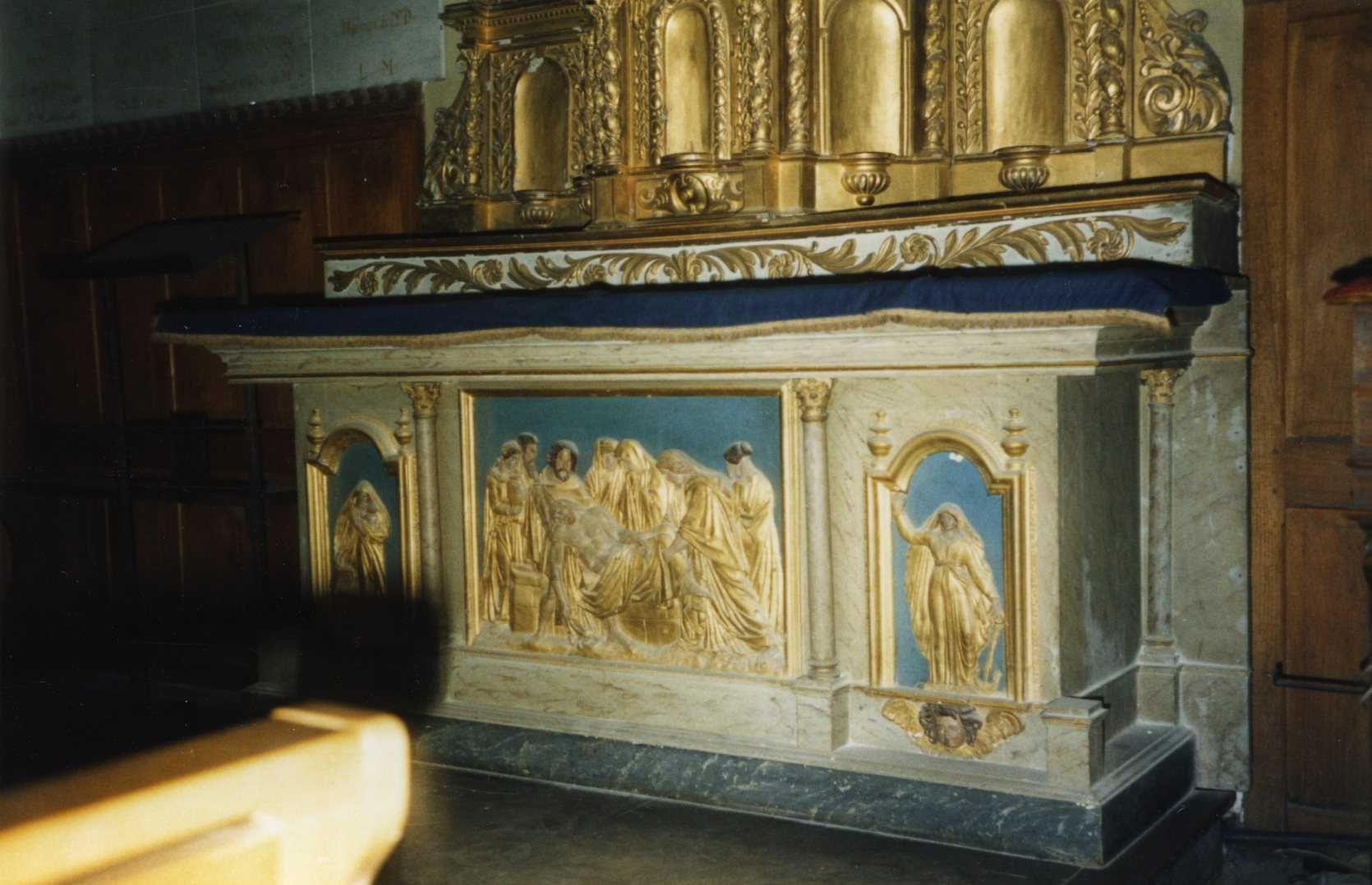 Précision représentation : Le bas-relief de la table d'autel représente la Mise au tombeau avec sept personnages, dont une jeune femme au chignon caractéristique, encadré par les vertus théologales.