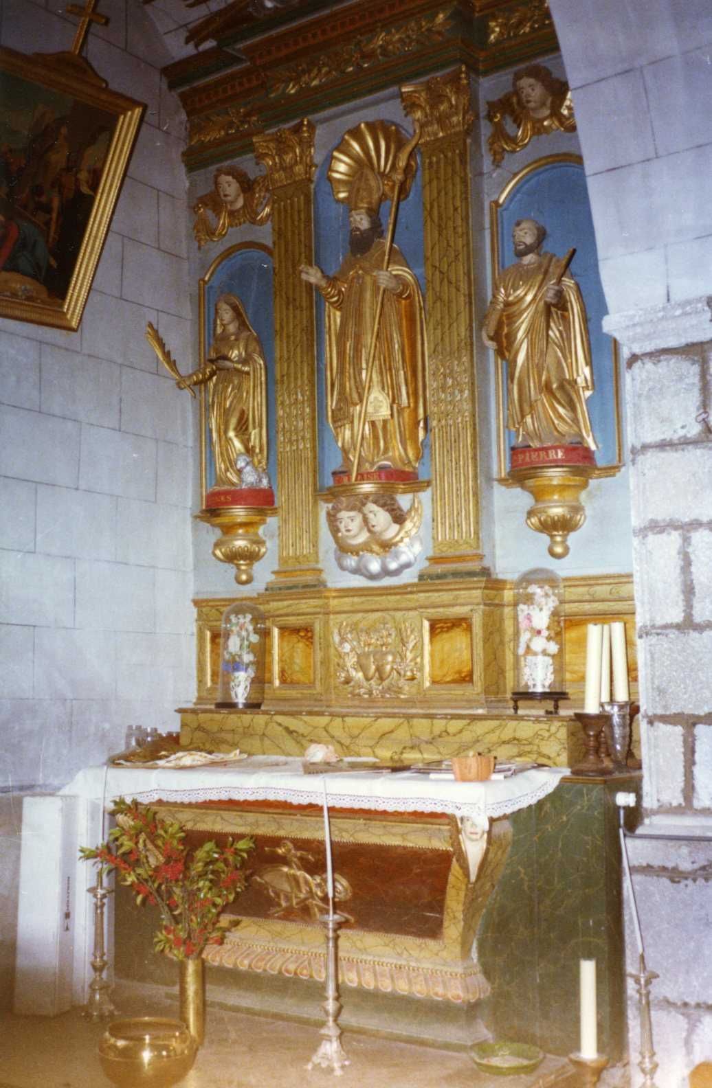 Description : Retable à niche centrale entourée de deux niches latérales. La niche centrale comporte une statue de saint Blaise, celle de gauche, une statue de sainte Agnès, et celle de droite, une statue de saint Pierre. Sur la porte du tabernacle, bas-relief représentant le Sacré-Coeur de Jésus et le Coeur immaculé de Marie.