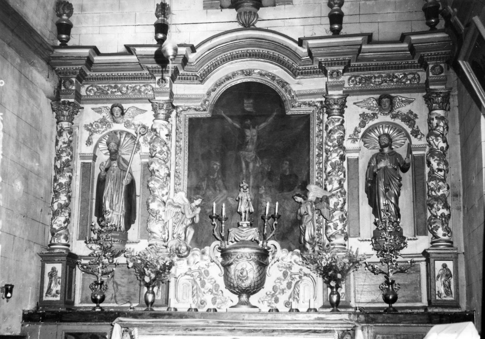 Description : Retable à trois éléments et colonnes à chapiteaux corinthiens, ornées de pampres. L'élément central formé d'une toile représente la Crucifixion, surmontée d'une niche dans laquelle se trouve une statue de saint Christophe portant l'Enfant Jésus sur l'épaule gauche. Dans les niches latérales, encadrées de pilastres, statues de saint Austremoine et saint Barthélémy.
