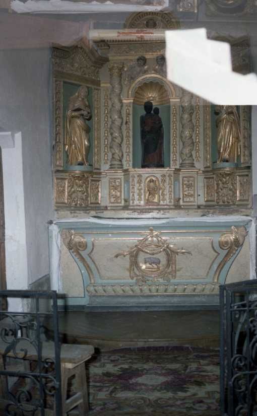 Description : Retable à panneaux central entouré de deux pans coupés. Le panneau central comporte une niche arrondie entourée de deux colonnes torses montées sur un entablement à panneaux sculptés dans le quel est encastré le tabernacle et supportant une corniche à entablement, elle-même surmontée d'un demi-cercle mouluré. Les deux pans coupés sont formés de panneaux rectangulaires dont la base repose sur de petits panneaux sculptés, le tout surmonté d'une corniche en fronton triangulaire. Dans la niche centrale, statue de la Vierge à l'Enfant en majesté. Devant le pan coupé de gauche, statue de Saint Anne, devant celui de droite, statue de Saint Joseph. Sur la porte du tabernacle, bas-relief représentant le Bon Pasteur, entouré de deux statuettes d'évangélistes. Autel tombeau.