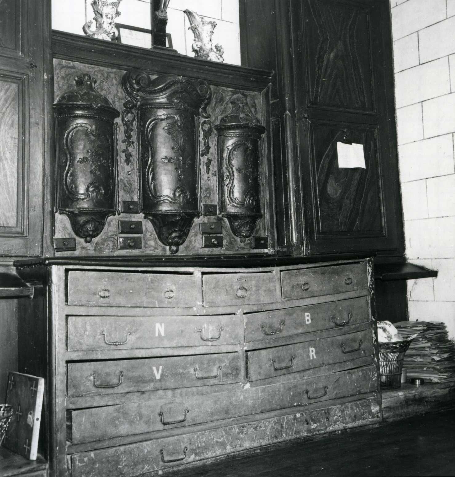 Historique : Ce meuble à tours constitue la partie centrale d'un meuble de sacristie. Il est vraisemblablement un remploi d'une partie du mobilier de la sacristie Nord, réutilisé dans l'actuelle sacristie construite en 1843.