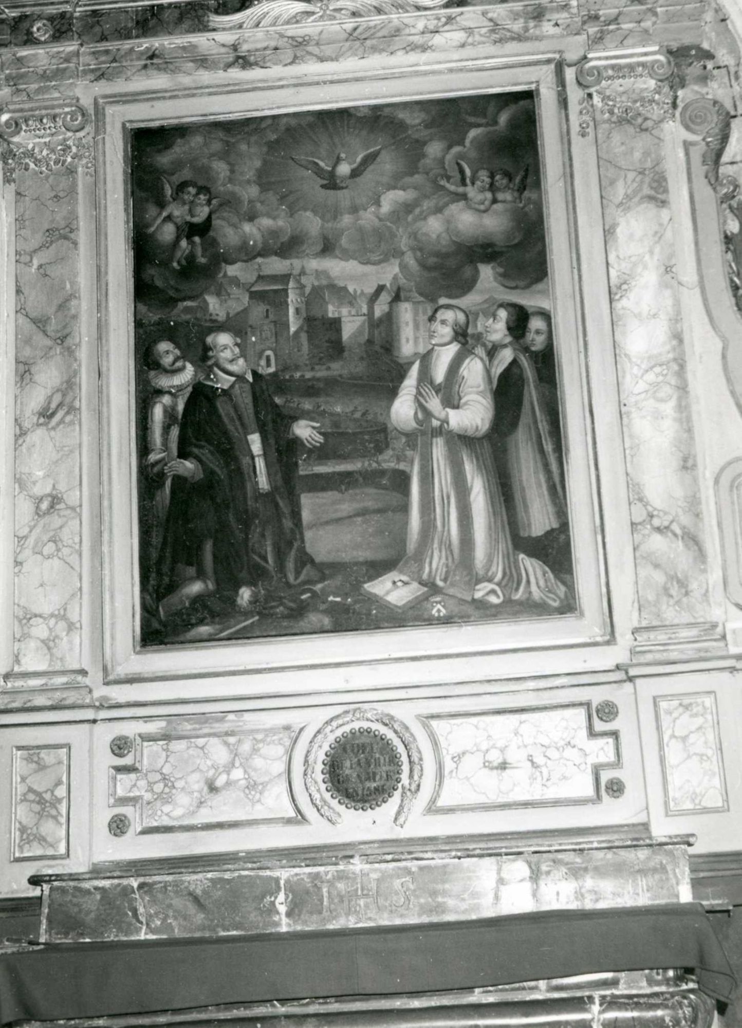 Précision inscription : Armoiries : armoiries de la famille de Chazettes de Bargues (en bas à droite). inscription : Voeu de la ville de Salers en 1586. Date : 1586.